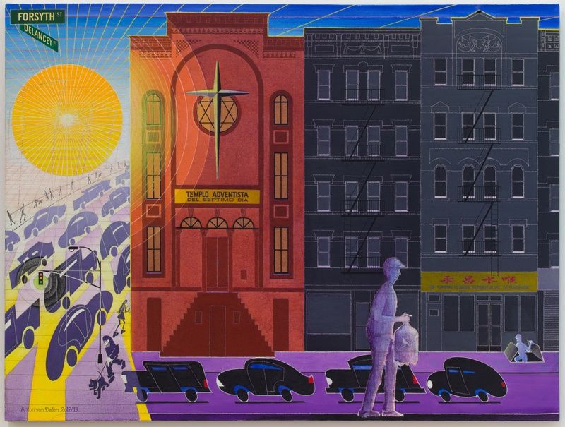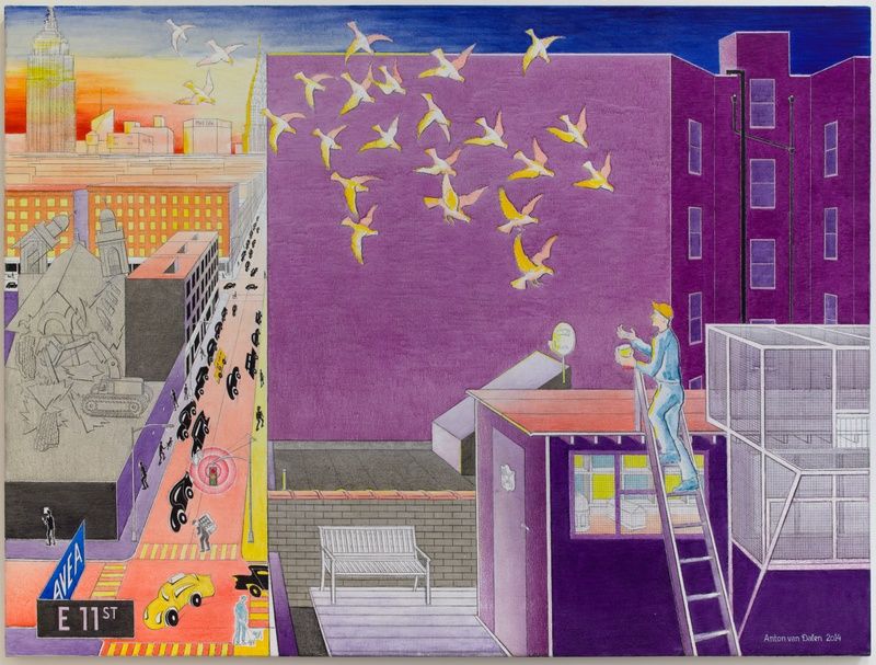 Anton van Dalen (b. 1938) was born in the Netherlands, emigrating with his family to Toronto in 1954, then moving to Rivington Street in 1966. Van Dalen recalls arriving to an East Village that resembled the second world war that he left behind, riddled by urban flight, poverty, and drugs. He also describes an environment that was rich with crossing cultures, sharing space and life on the sidewalk. Van Dalen has lived in the East Village since this time. His paintings of the city contain abundant color and movement, often drafted from a semi-aerial perspective. Birds—specifically, carrier pigeons—appear frequently in van Dalen’s works. “The birds have really been my life since I was a child,” he explains. “Some people might call it an escape; I think of it as a parallel universe.” In a broader sense, they also stand a symbol of unity, carrying messages between vast divides.