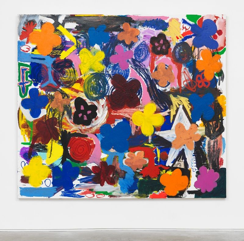 Oil, oil stick, tempera, acrylic, permanent marker, gesso on canvas
