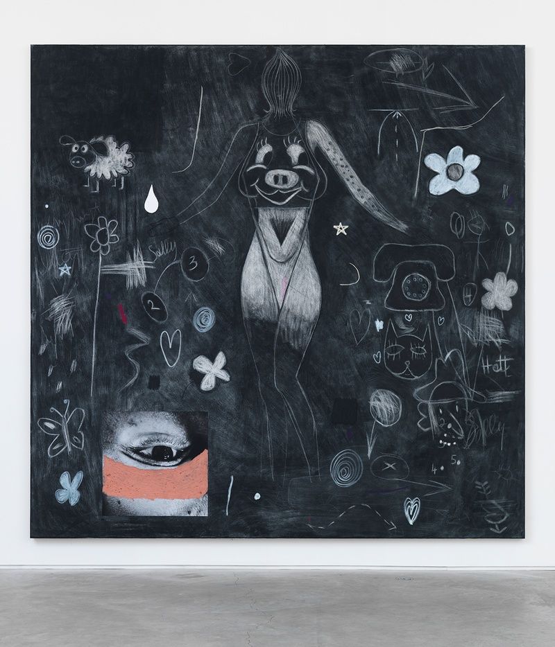 Charcoal, pastel, permanent marker, oil stick, gesso on canvas