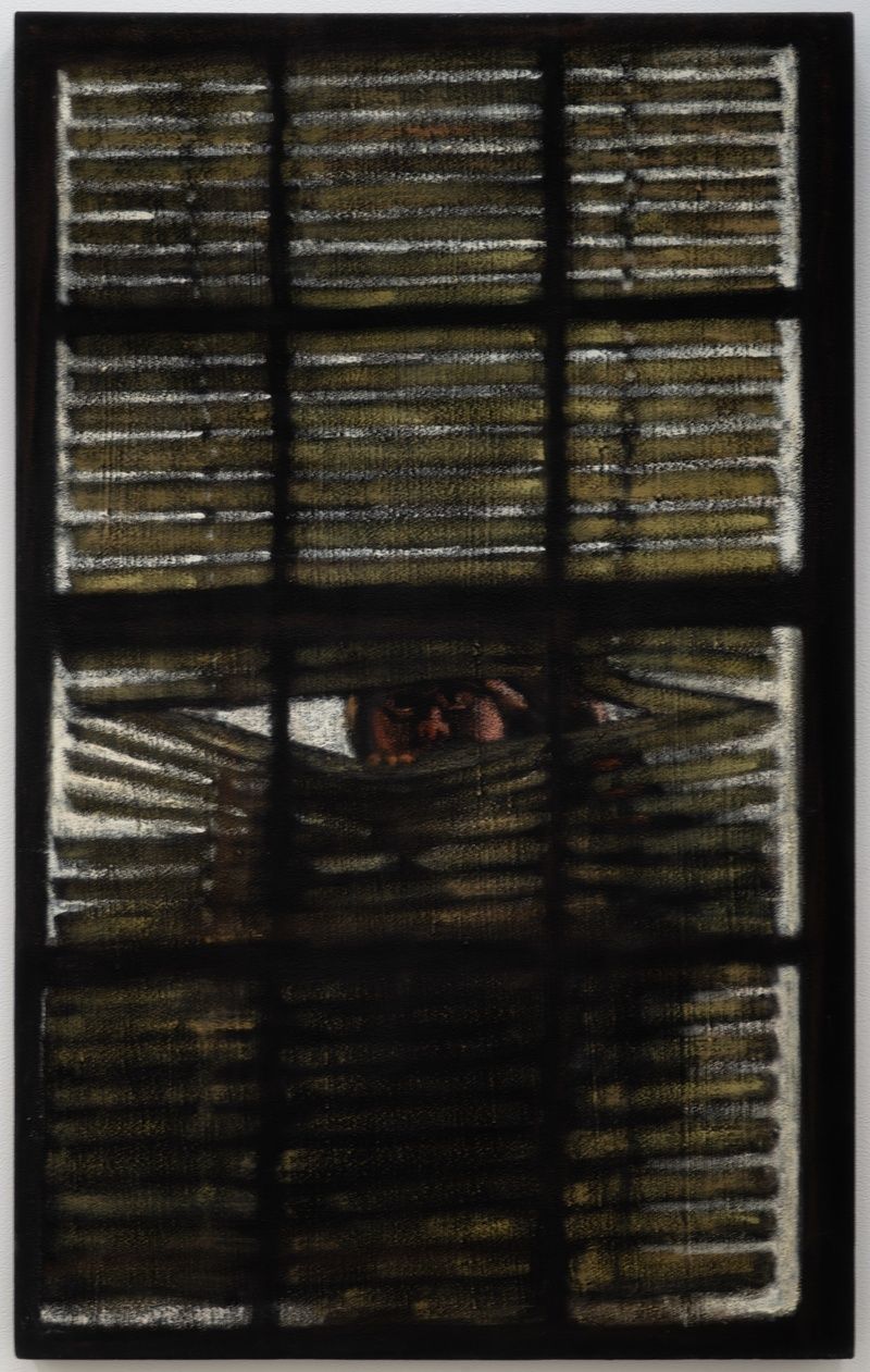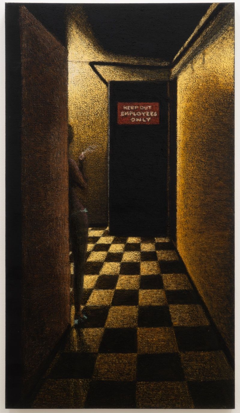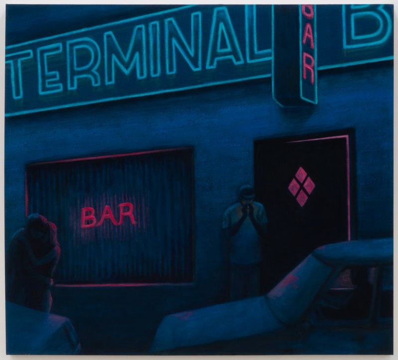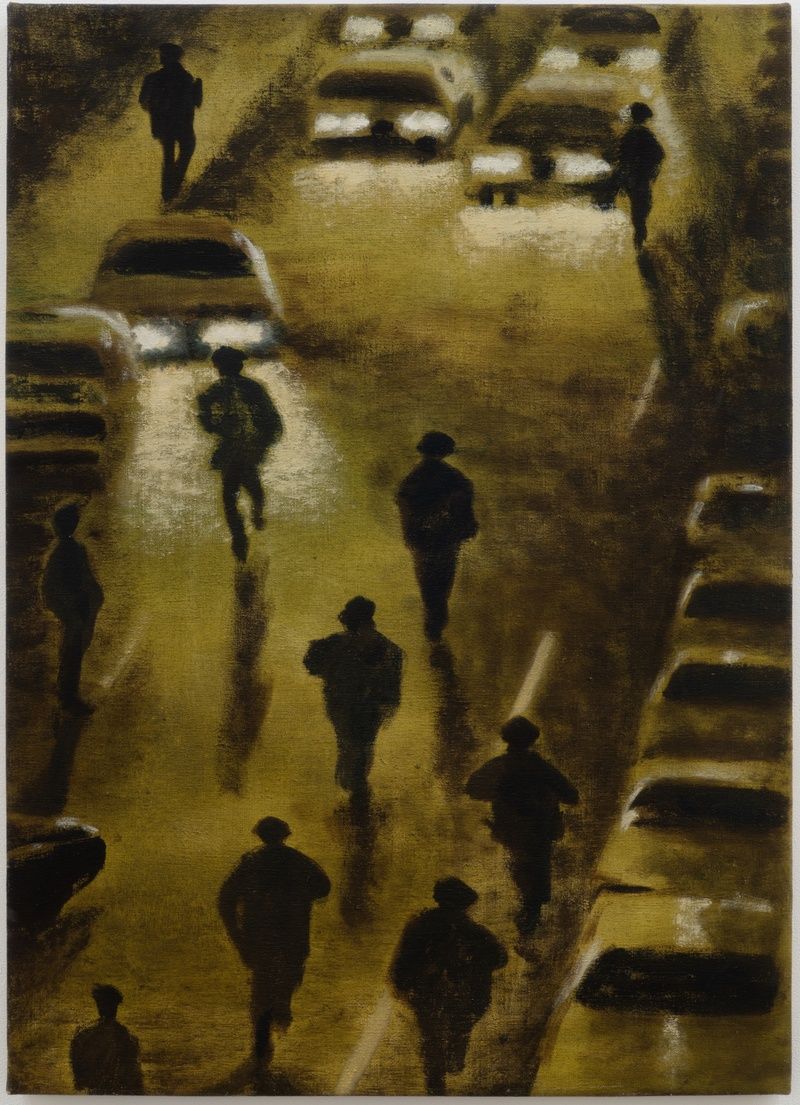 Dickson soon began to carry around a small, discrete camera as a way to record fleeting episodes. Many of these impressionistic photographs contain a rich field of dark blackness, punctuated by effervescent neon signs, the glow of a cigarette being lit, the fluorescent insides of a storefront, or the reflection of rain against the streets. As well as her snapshots, Dickson also made rough charcoal sketches describing the posture of figures—rushing, waiting, a young man being frisked, the shape of a cop on a horse—and this very gesture of peering over a ledge, looking in, like the artist. As much documentary as they are voyeuristic, these are the details that fill Dickson’s paintings. Since the 1980s, starting at Times Square, she has chronicled and memorialized scenes of life in America, from the glittering spectacles of Las Vegas casinos and demolition derbies, to the monotony of strip malls, highways, and suburban sprawl. In Dickson’s own words, “I paint to locate baseline reality within an unstable world.”
