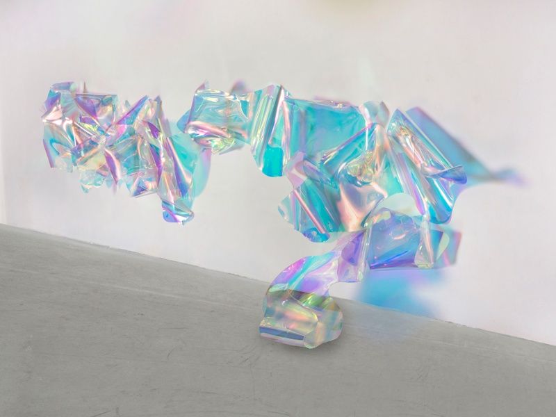 In addition, the presentation is amplified by Bewanol (2025), a significant wall-based work incorporating expansive curved, iridescent forms. Extending outward from the wall, this piece pushes the environmental logic of Fischer’s suspended sculpture, blurring distinctions between object and architecture and further activating the surrounding environment. Wexolin (2025) is Fischer’s latest exploration that, for the first time, brings together acrylic glass and PET foil. Delicate, thin sheets of PET foil drape over a suspended acrylic glass structure, creating a nuanced interplay of material, transparency, and light that introduces a new material sensitivity to Fischer’s practice.