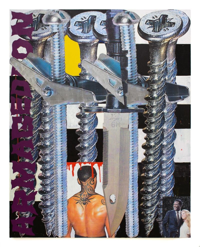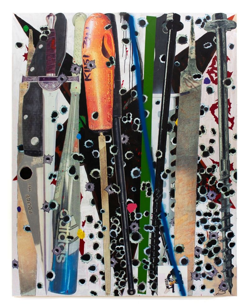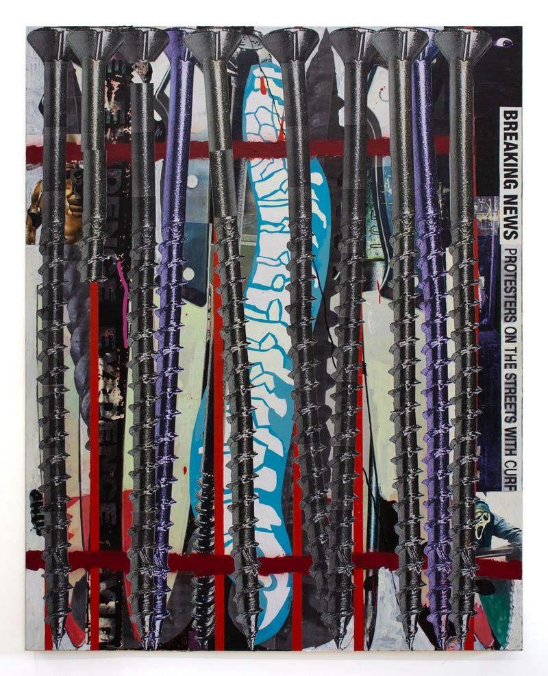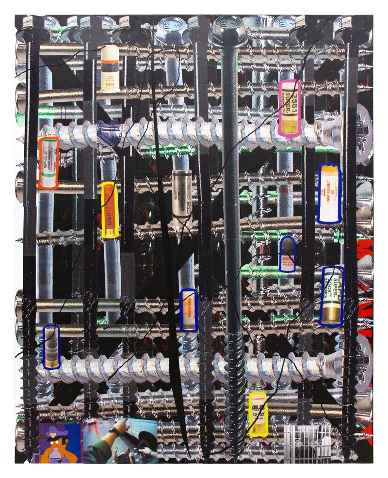 The idea of posturing is central to the way that these paintings work. Spratley’s screws and knives are personified and antisocial. They dance, they lean on one another, they crowd together, defying gravity, exuding danger and violence. Then fear dissipates with the realization that these sharp, shiny objects are frozen in a liminal space. They would fall over upon entering the real world, rendering themselves harmless. The fallacy of danger can both trigger violent actions and protect you from them. These survival strategies rooted in agonistic behavior are an everyday occurrence for some when moving through urban communities, and they drive much of hip hop music. The chopped and screwed screws and knives are a visualization of the same sort of code-switching required to maneuver today’s world.