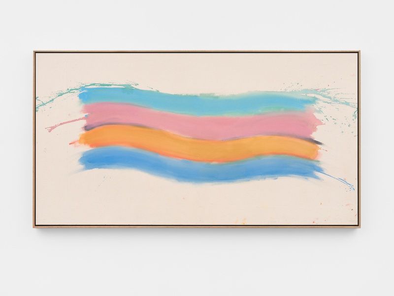 In addition to her signature wave form, two works from 1971—Winter and Immirem-Immimo—bring focus to her stain paintings, further expanding our perspective on Lipsky’s oeuvre in relation to its very beginnings. In these, washes of color again settle into radiant parallels yet remain horizontally “straight,” establishing an all-over rectangular composition in counterpoint to the free-floating undulating curve. Here color coheres dimensionally to suggest a horizon line stacked with a smog line, or light pressing through an obstructed window. Recent iterations like Dream (2024) and True Colors (2023) further clarify these optical effects through solidifying bands of like color held apart by slim zones of contrasting hues between them. Lost Painting (2023) more literally reimagines an early composition, since lost (seen today only in photographs).