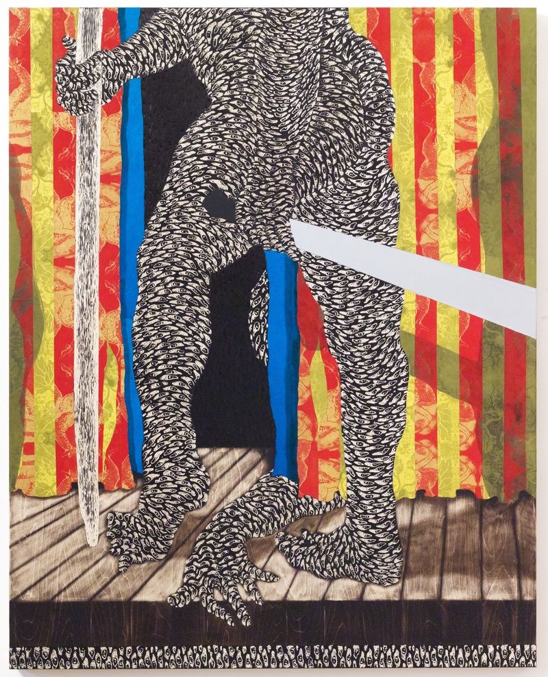 These non-gendered, non-racialized bodies strikingly document an almost intuitive sense of resilience and profundity, visualizing universal elements of the human condition that are without regard for race, sexuality orientation, or gender identity. We may be mesmerized by the beauty of their sensuous shape, but we are also transfixed by their shadows as they appear on the vividly-colored and patterned curtains, share the stage, and dwell on the ornate, painterly abstract backgrounds. Sinewy lines, seemingly frenetic curvilinear marks, guide our eyes to the ways in which William balances suggestive abstract sensibilities with expressive organic qualities. It is in this context that William’s recent work captivates us, through the haptic that suggests movement, color, form, and, most importantly, a harmonious sensuality. His mixed-media works possess a compositional logic that examines how painting and printmaking energetically coalesce on the surfaces of the panels. In these decidedly detailed-oriented works, William explores the role of painting and printmaking as processes that intertwine the hand with the mechanical. We can almost feel the reverence for the materiality generated by vivid areas of color and a meticulousness of line. This cross-disciplinary expertise allows the viewer to relish in his deft control and skill in emotive mark making. The works gathered in this exhibition provide further demonstration of the wonder and ingenuity of William’s unique visual harmony and compositional dynamism.