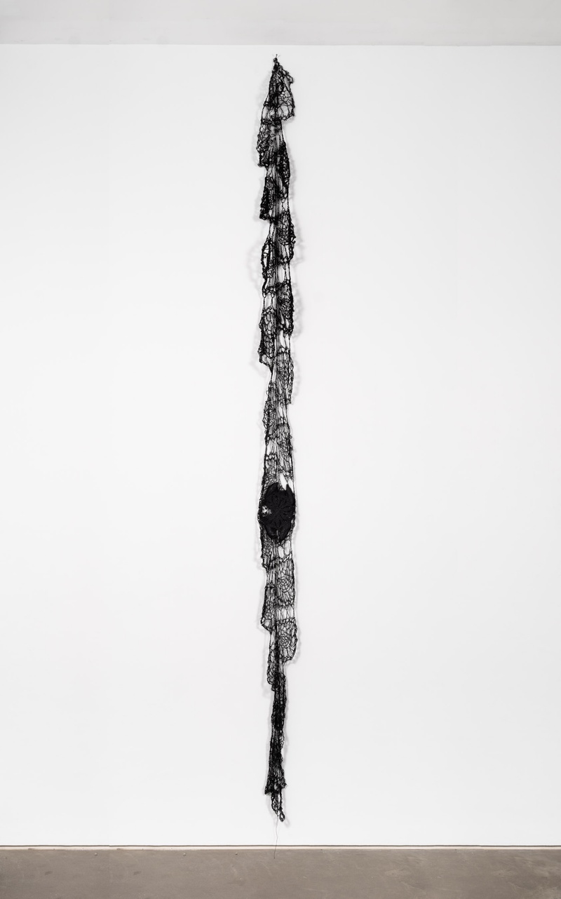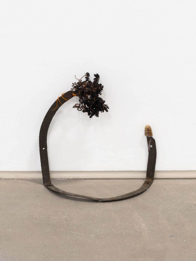 Found metal, horsehair, copper wire, and rattlesnake rattle