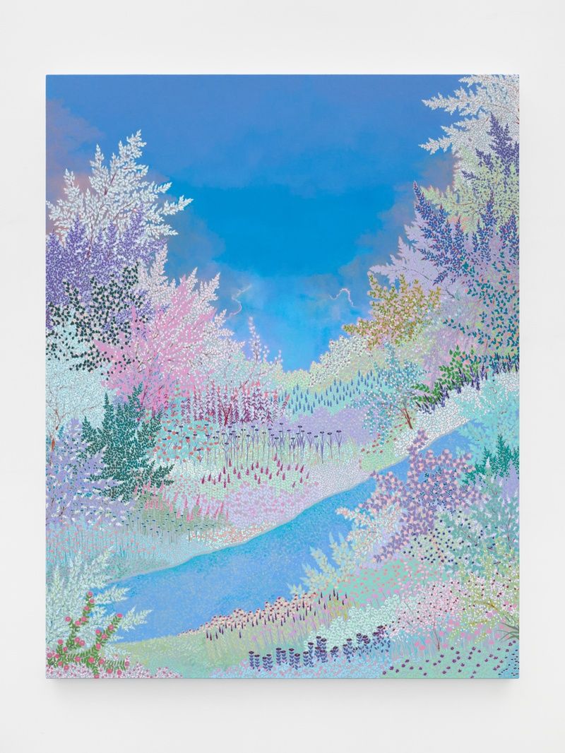 John McAllister’s phosphorescent, illuminated landscape paintings observe the strangeness of nature and its cycles. rapt haven held (2025) gently contrasts the singular course of a human life with the perennial cycles of the environment, seeming to depict a ceaseless “in between” that could be read equally as dawn, dusk, daylight, or night. In this work, the sky’s clouds glow gently with a kind of heavenly light, contemplative humanity’s relationship with nature in a modern homage to early 20th-century aesthetics. The only other legible “image” in the exhibition is also a landscape, Geoffrey Holder’s Untitled (c. late 1970s). Although better known for his portraiture, Holder’s landscape paintings reflect the origins of his polymathic practice as an artist and theatre performer, through his deep connection to the natural world and his early life in Trinidad and Tobago. These compositions depict lush, tropical environments rendered with a theatrical sense of atmosphere. Much like the imagined subjects of his portraits, Holder’s landscapes reach for emotional resonance over strict realism, blending personal mythologies with an almost stage-like presentation of nature.