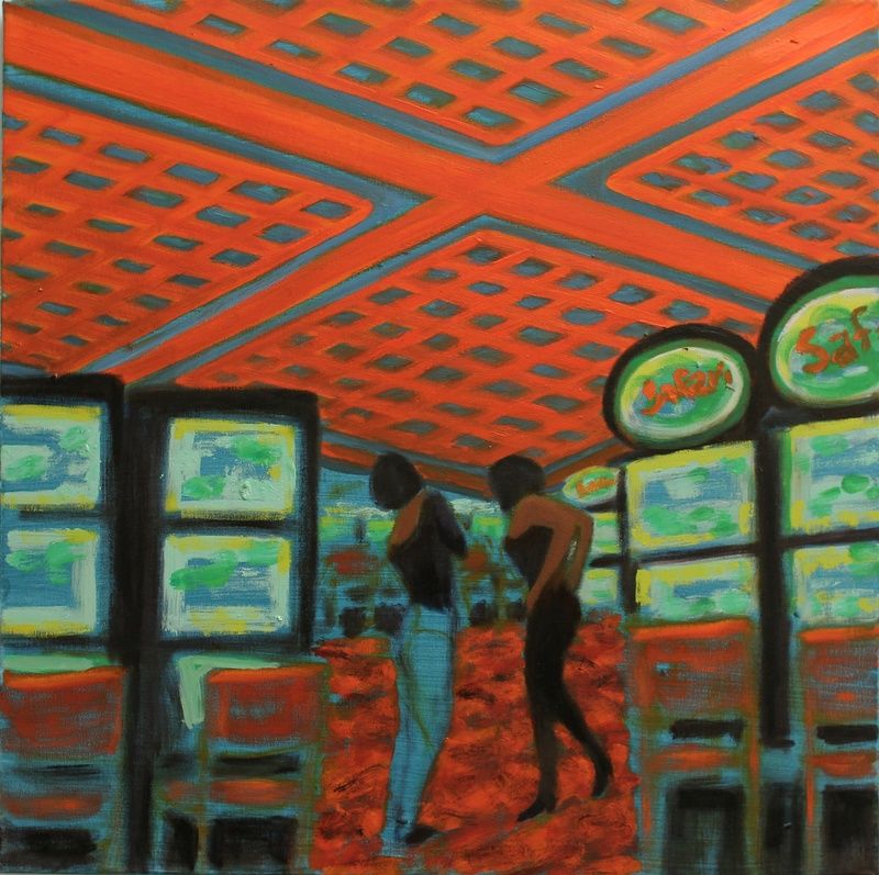 My focus on the man-made extends to materials, recruiting various synthetics, such as astroturf, vinyl, sandpaper, Tyvek or carpet, as paint grounds, selected both for sensual tactility and for the resonance of a particular material with a particular subject; fake grass, for windshield- viewed blurs of nature; sandpaper for “look but don’t touch” strippers; carpet samples for portraits of suburban homes. I choose to allow these substrates to shiver through the image visually challenging the coherence of the illusion I have created, reminding viewers that something lies behind the image, highlighting layers of references. I chose to examine the psychological freight of the manmade world, focusing on the social structuring of fear and desire and its disruptions by the familiar grown strange, aiming to pull the unnoticed, the unquestioned background “room tone” of daily life into the foreground, thus providing space for reflection on the usually unquestioned substrates of our lives. I am at an ecstatic moment in my work, eagerly foraging through our shifting landscape for reflections of my own concerns that are key themes in the broader dialogue."