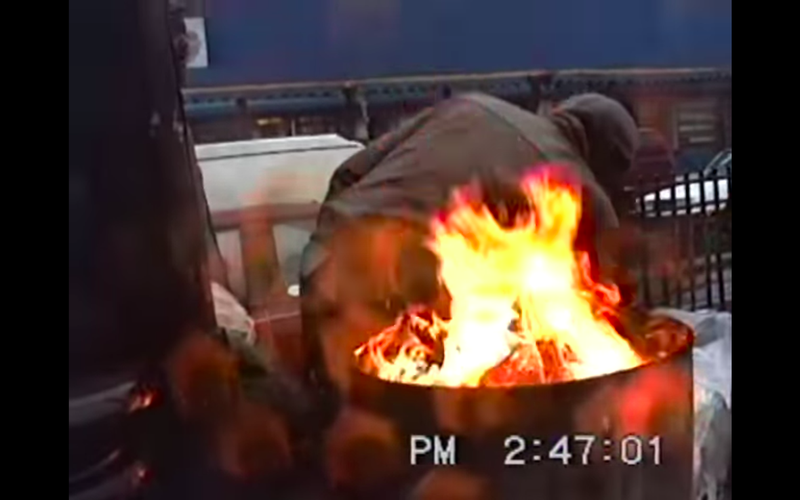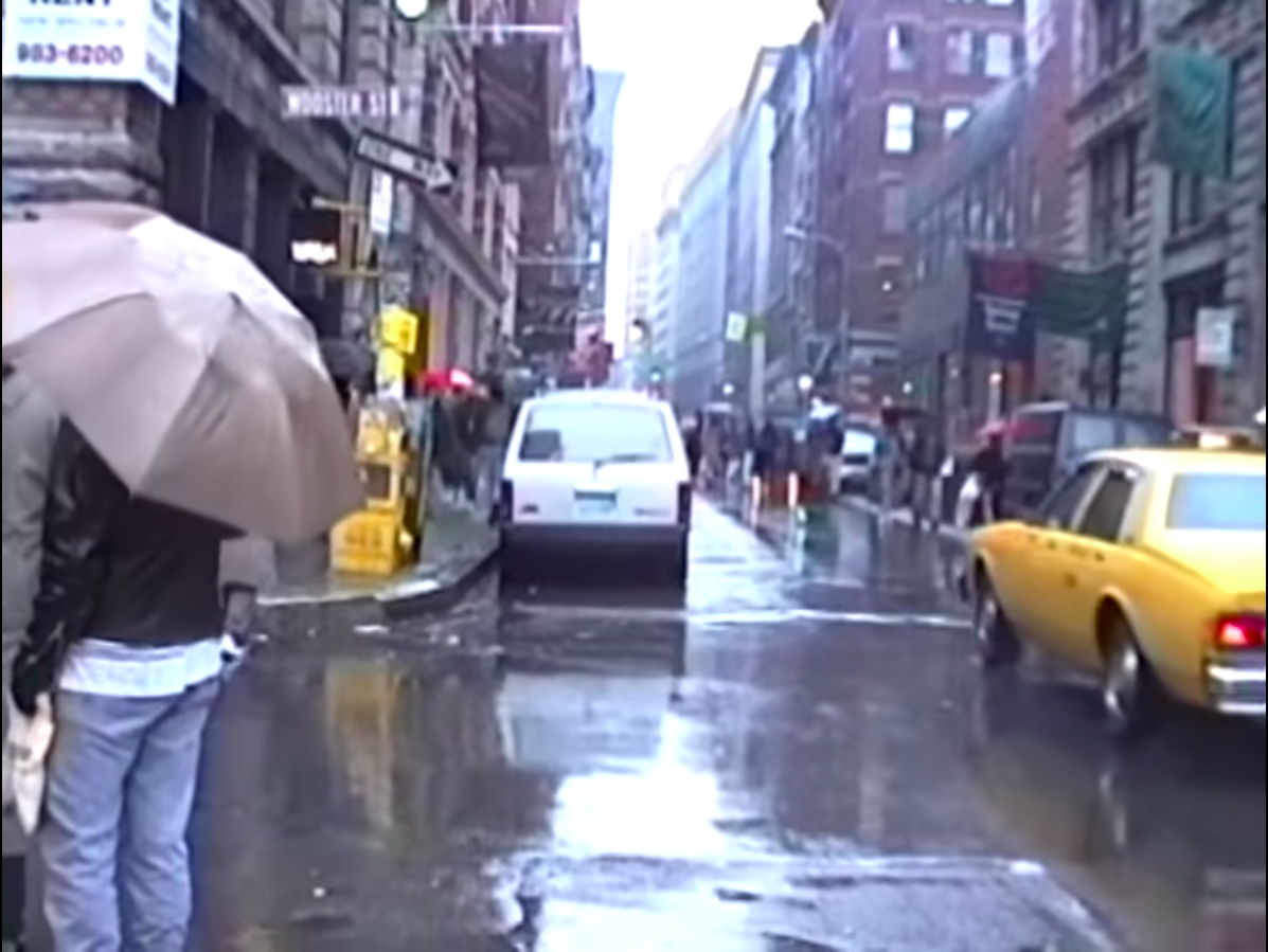 Made at the end of 1990, Mekas begins A Walk with his lens pointed to the ground, intent on filming the raindrops falling into a puddle. An early exercise in the unedited, single-take video form, the work journeys from 80 Wooster Street in Soho, moving at the speed of Mekas’ meandering stroll. “A displaced person is a voyeur, is a walker,” he relates in the midst of this wet cityscape, “Nobody really knows where their roots are, what home is. Drop me in a desert, come back in a few days and I will have roots.” A Walk is classic Mekas, grasping at the textures of the world closest at hand. Occasionally, he walks right up to an object with his camera, zooming in an attempt to get closer to its edges. Moving in even farther, the image is so close as to be made far—an unfocused blur. As he travels and speaks behind the camera, Mekas mingles with the atmospheric noise of the city. The sound of everything is made that much louder by a thick film of water left by the rain, the rubber of car tires peeling high pitched against it.