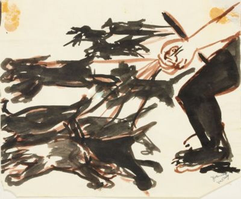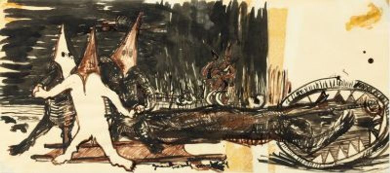 Depicting klan violence, the painting that these smaller works progressed was 9 by 12 feet and mounted as a mural. While the exact reason for the work’s disappearance remains unclear, resistance to it was almost certainly politically motivated. Although Southern Illinois University campuses were integrated at the time, Carbondale, along with most of the southern midwest, remained segregated until the 1964 Civil Rights Act was passed. The debate over whether to hang the mural ran concurrent to the national debate over civil rights in a segregated community. As in her major paintings that would follow, this selection of works on paper convey McNeely’s deep understanding of movement and expression. Key motifs that would later become central to her work appear here, including drastic use of light and shadow, experiments with dimensionality and visual framing devices, and the use of multiple panels to convey a visual narrative. If the work in question is truly lost, it serves as a case study in US censorship on an institutional level. Nevertheless, the works that remain speak volumes to McNeely’s personal and artistic reaction to and engagement with the political events of this time, and to the intensity of her concerns that would inform the entirety of her 60-year career to come.