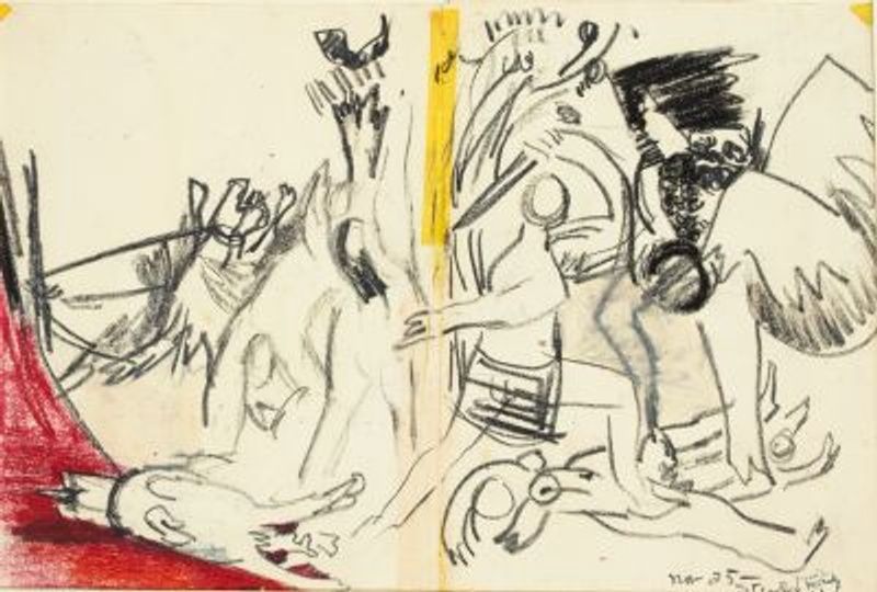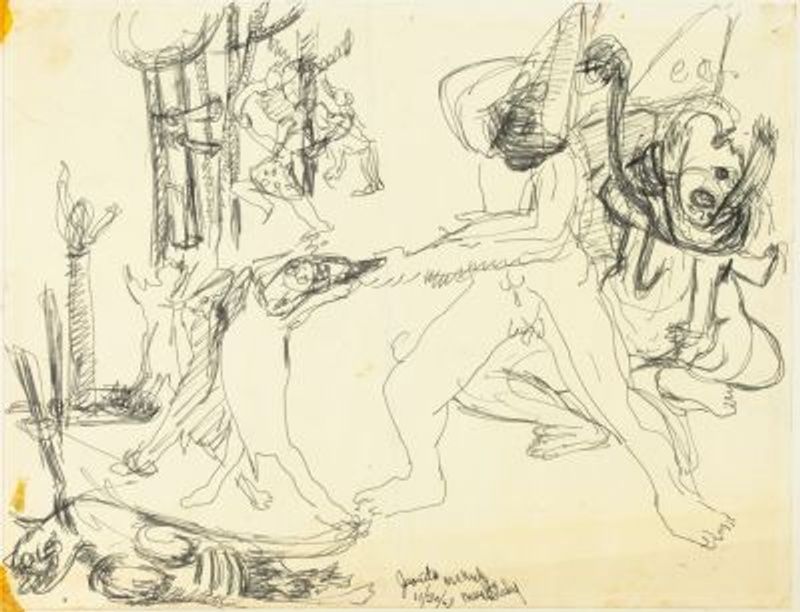 Juanita McNeely is renowned for her depiction of the extreme physicality and movement of the human figure within her paintings. McNeely first moved to New York City in 1967, where her figurative work became central to the development of feminist art and discourses. Prior to this, she was a graduate student at the Southern Illinois University in Carbondale, Illinois. This online presentation consists of a series of studies for what would have been her earliest major work from this time: a lost mural that was made 1963-64. Entitled Man’s Injustice to Man, it was intended for the Morris library at the Southern Illinois University, as reported by the student newspaper at the time and by the artist herself. What remains of the work is a series of paintings and sketches on paper, accompanied by progress photographs of McNeely working on the mural.