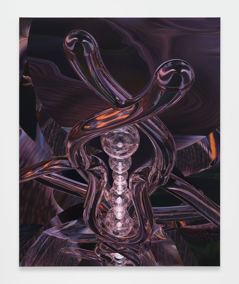 This body of work finds its textures and forms in deep-sea beings, archeological holy sites, and computational glitches. The ctenophore (or comb jelly) is a central figure. This bioluminescent marine invertebrate resembles digital ectoplasm, yet emerged around 740 million years ago as one of the earliest complex animals and a significant evolutionary step toward human life. Made up mostly of water, we know most about them through photographs. Those images, sometimes pixelated, refract in patterns across the shifting surfaces in Khoury’s compositions. As if echoing their proximity to us in space-time, these photographic details reappear in the darkened “sky” and reflective coils of (rhythm version) (2024-25), or in the tessellated far-ground of orbital column (2024-25).