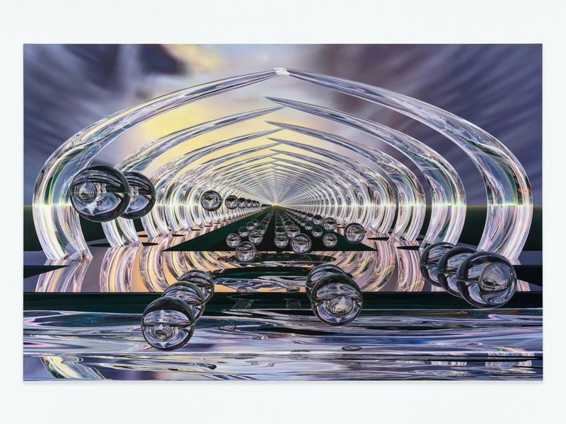 In Nexus (2023-24) Khoury ideates another epic event: an infinitely repeating portal. The work pictures the opening of an archway over a rectangular abyss, out of which rows of clear spheres float like weightless water droplets toward a vanishing point. The scene recurs and distorts through the internal curvature of these suspended orbs. Thus the “nexus” evokes an eternal entrance between untold future and distant geological past, like prehistoric waterways convening to form a cradle of future life. In conversation with Nexus, and the only image evading a landscape, ball is life (lodestar) (2025) forms an altarpiece to the orb itself as the true birthplace of all being.