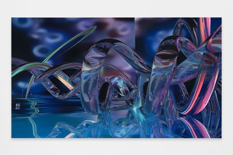 Chanel Khoury’s work is deeply technical, driven by forces simultaneously slow, digital, ancient, and bright. Her oil paintings begin through a lengthy process of virtual world-building, intuiting an untouched world containing the primordial essence of life. Glistening, transparent forms resemble those found in the smallest markers and grandest phenomena of nature: spheres, spirals, columns, basins, and mirror-images. Bit by bit, Khoury meticulously transposes still images of this world into oil paint on canvas. Memory Bands represents works realized from this universe over the past two years, as well as site-responsive elements.