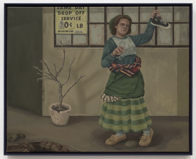 Michael Cline is a self-described storyteller, making paintings filled with strange configurations of people and their surroundings. Bodies are in motion and yet caught catatonically stiff within streetscapes, contained by windows, or piled with objects. These scenes tend to be awash with a greenish light, adding a grotesque quality to their discordant details and faded palette. Liberally mixing styles and narratives, Cline renders an odd feeling of ambiguity and vulnerability.
