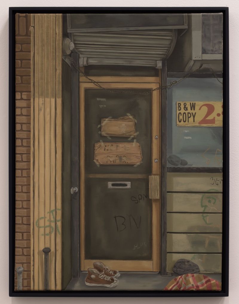 Sharp shifts in scale add to this illusionistic effect. In many works a figure might stand in the shallow space between the flat surface of a wall and the picture frame. Details like soft shadows, a crack in the wall, or an odd doorway furnish this backdrop. By contrast, Cline’s earlier highly textured relief works move drastically closer to this plane, focusing on left-behind pieces of tape, torn bits of paper, and false wooden beams in trompe-l’oeil fashion. Impromptu and handprinted signs feature repeatedly, tipping into awkwardness with a misspelled word or adjusted numbers. These pieces of information provide an in-between setting that is as telling, if not more-so, as the characters they contain. Spilling with symbols, Cline’s works are irreducible to a single meaning, interval, or depth.