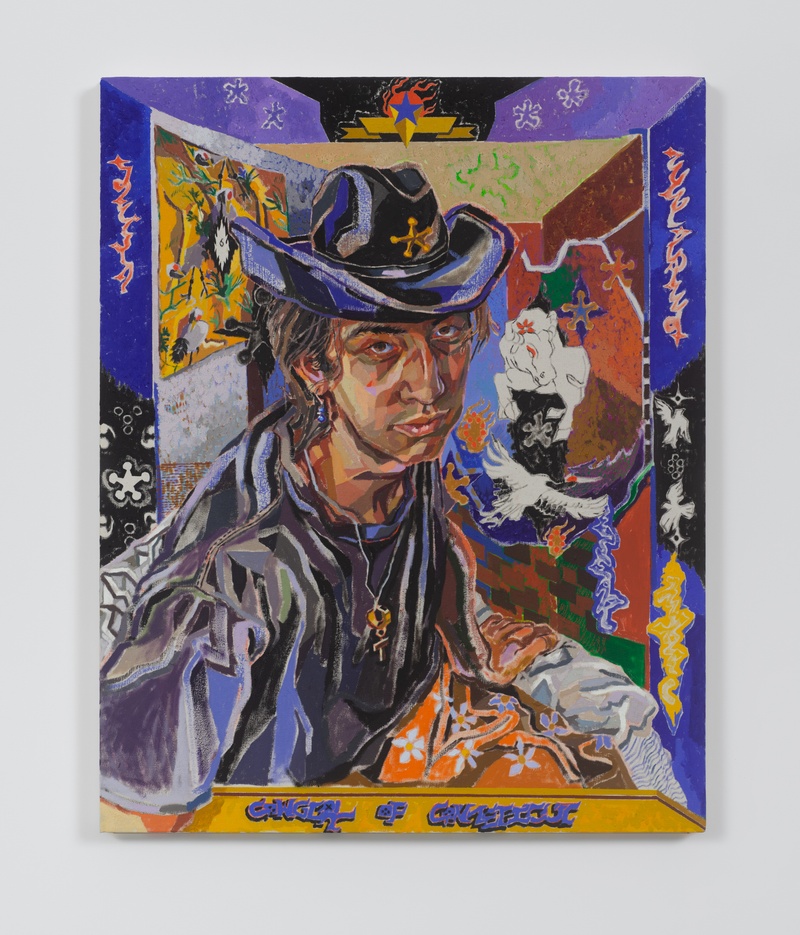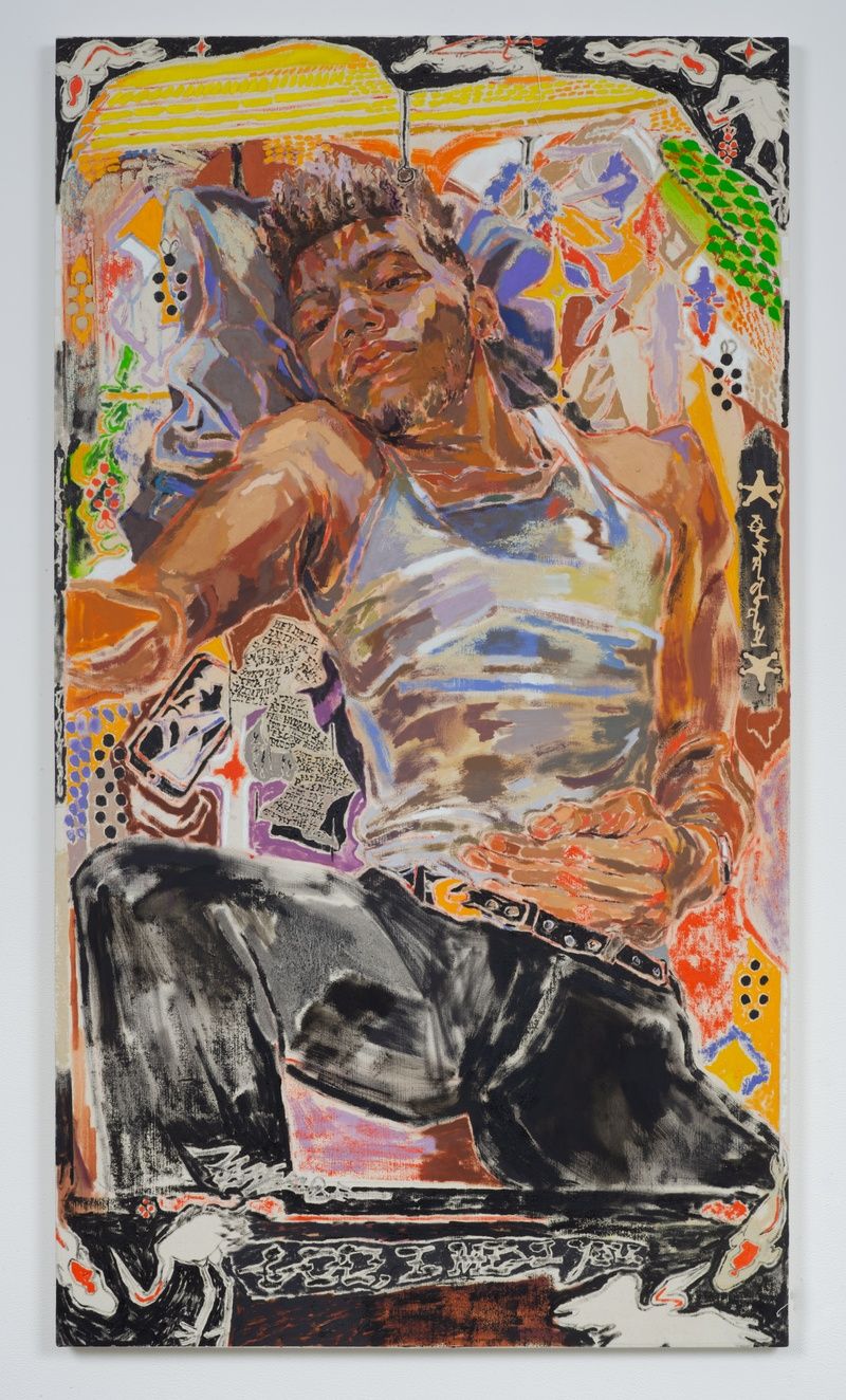 A distinct sense of symmetry can be found in yi Hou’s densely-detailed images, contributing to a compositional logic that is able to hold together a great deal of texture around each of the relationships being represented. Negotiating questions of opacity and (il)legibility, yi Hou employs polysemic symbols such as the five-pointed star, an icon laden with signification between East and West, to emphasize the buried yet multifarious meanings that surround his subjects. In this vein, at times the artist fuses the Chinese calligraphic tradition with graffiti seen on the streets of New York. Yi Hou also makes poetic use of the borders of his works, treating this marginal space as an expression of the interrelation between himself and the sitter—while at the same time reflecting upon the limits of grasping this relation. In doing so, the artist’s paintings of others become a form of address, conjuring new signs and meanings to be shared in space. Here, yi Hou intricately demonstrates, in his words, “painting as a practice of dignity.”