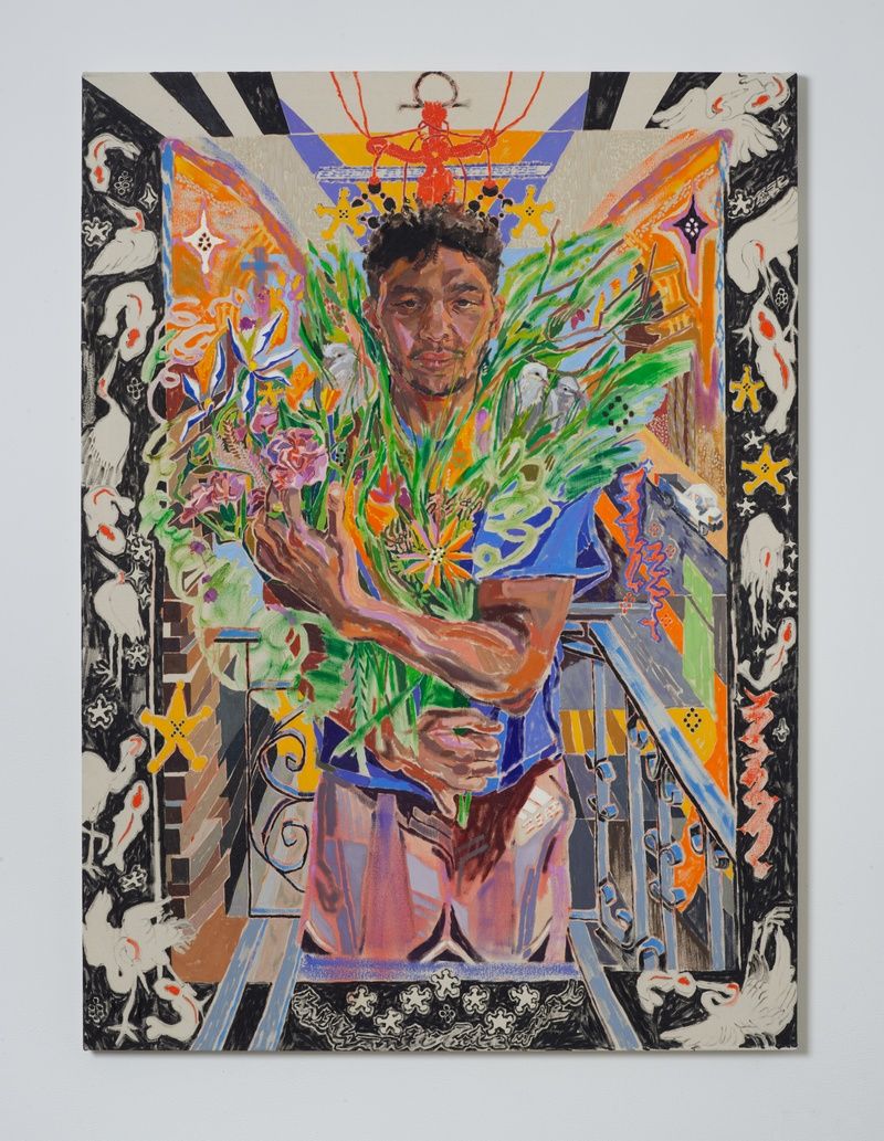 Oscar yi Hou’s work is anchored in personhood. While this exhibition presents a series of new portraits, what yi Hou’s paintings really record is the relationship shared between the sitter and the artist. Foregoing fixed representation, the works in A sky-licker relation offer a testament to living alongside others. Made over the past year and a half, these works mark the importance and influence of nearness; the being-with of a queer lifeworld. In each work, yi Hou pulls together a syncretic field of iconography that describes complex layers of identity and relation. Through this process, nearness is not only at the core of the work’s making, but now actively occurs within the visual plane of the work as well. The exhibition title is itself is the result of a series of relations: sky- licker is lifted from Aimé Césaire's poem Cahier d'un retour au pays natal, which yi Hou first came across in Frantz Fanon’s Wretched of the Earth. Like the evocation of a sky licker, yi Hou’s given name in Chinese refers to a bird cry (一鸣) and he often uses birds as a self-signifier in his paintings and poetry, boundless and in flight.
