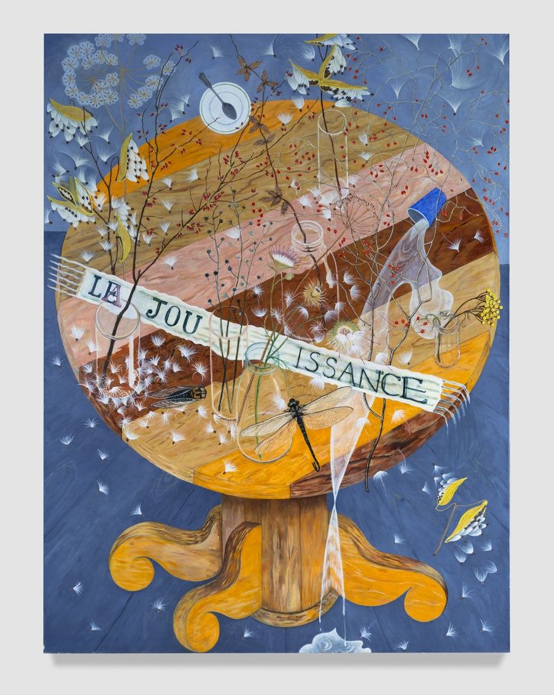 Completed during this same period, works like Good Energy (2002-03) and La Jouissance (1996-98; 2002-03) reflect a transmutation of such catastrophe through ritualized imagination. Reaching for what Howland describes as, “a different kind of energy,” these works suggest the lively and mysterious connection between human, animal, and plant. The latter, a still life from the artist’s studio, expresses an untranslatable phrase found in French feminist literature, La Jouissance—defined as the “enjoyment of rights: sexual, political, and economic. Total access, total participation, total ecstasy.” Both works intermingle flora and fauna, connecting to Howland’s Weeds of New York series made over the preceding decades. Across those vertical canvases, a medley of plants (named in the title of each) overtake an emptied background. To Howland, these weeds are survivors—uprooted and determined to thrive through the cracks of industrial life.