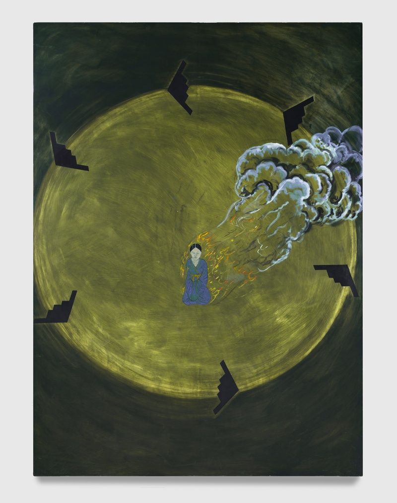 Works like Burning Girl and Stealth Bombers (2003-04) and Oil Spill and Camouflage (2007/2025) reflect a potent meeting of such subjects and influences. In the former, Howland juxtaposes an eighth-century Japanese sculpture engulfed in flames, referencing the Buddhist Monks who self-immolated in protest of war in Vietnam. Against a field of green, she is circled by the conspicuous triangular forms of B-2 Stealth Bombers. In the latter, the same burning woman appears in the crosshairs of two built roads and another set of Stealth Bombers. The background forms an abstracted horizon-line between a camouflage-print sky and an oil-slick ocean. In contrast, Ring of Fire, with Water Garden (2001-02) depicts an ancient burning being at the center of a green garden, surrounded by a gridded garden. A ring of fire separates the two as several birds circle overhead. Flowing from hatched eggs and a strand of DNA, these combinations suggest a distinctly biological cycle of life, death, and rebirth.