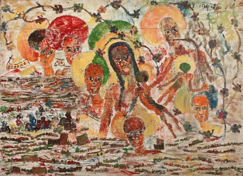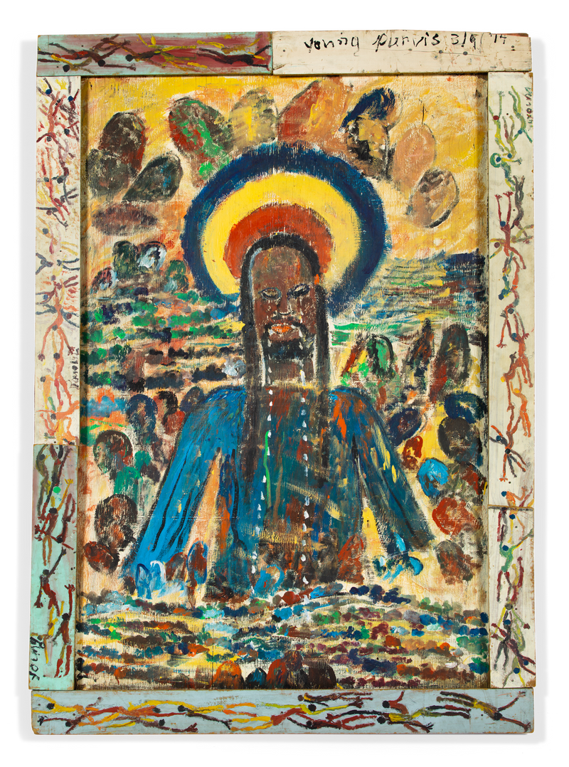 Young was self-taught, producing a remarkable number of works over his lifetime that convey rich scenes—at once pictorial and spiritual—of his life spent in the inner-city Miami neighborhood of Overtown. Informed by an early practice of drawing from life, Young began making paintings in the 1960s. Blending techniques of painting, drawing, and collage, Young collected discarded materials found on the streets and in abandoned buildings across his locale to incorporate as the surfaces for his work. Elements of action, figuration, and storytelling are laid over a series of structural devices, activating the ways in which the found materials onto which Young painted would serve to frame the images placed upon them. While some of these panels are smoother or more straightforward in proportion, others approach a mode of assemblage that reflect the variable and multi-layered narratives found across the artist’s work. The materiality of Young’s paintings reflects the artist’s own relationship to architecture, place, and time in Overtown. This sense of site-specificity is translated when encountering the works in person, whereby the panels offer a certain reconstruction of the environments from which they once came.