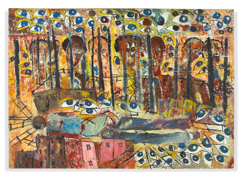 PART ONE is presented November 1–December 1, 2020 at jamesfuentes.online, consisting of a series of works that range in subject—depicting cities, angels, and figures playing games, riding horses, celebrating, or in procession. Many of these works share one common element: eyes that float across the paintings. Young believed that green and blue eyes were watching over him at all times, and likely controlling the world at large. Here, the eyes that seemed to have followed the artist as he lived and worked now stare back upon the viewer, enlarged and crammed between objects, multiplying en masse across the panel, or hiding between and within structural details. Upon each ground, Young presented highly densely populated scenes that show bodies in states of movement, floating, and reclining. In many works Young conveys scenes of procession and transcendence, found in funeral marches, riots, and in figures traversing train tracks or ascending to the heavens. In some, the red sun appears, considered to be an omen of death, either material or metaphysical. In others a large, saintly body is carried horizontally by many smaller figures. These paintings point to the intersection of larger themes in Young’s work, where spiritual elements factor into scenes of community mourning and celebration.