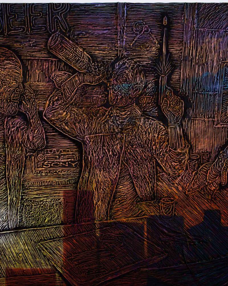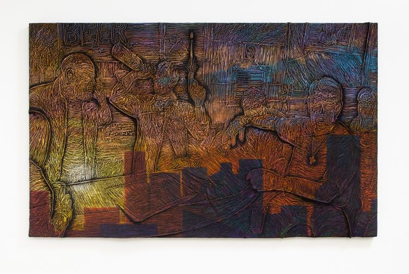 Ernesto Renda’s large-scale wax pastel rubbing carries two images within it: the first is a sunrise in full color against the sky behind city buildings, painted onto a canvas that also contains another image in relief form of figures populating a bar, which is picked up using a frottage technique. The work feels out its own dimensions in ways that are both technically flattened into the form of a painting, at the same time pushing into the limitations of what an image even is or may be. The eye reads the inherent images at two levels, in two perspectives and palettes, and yet these paired images become inextricably combined within the rectangular frame of the work—which, in doing so, becomes the site of their distortion and transformation. In the past, Renda has compared his 3-dimensional relief technique to the intrinsic presence of a fingerprint, which at once exhaustively designates the subject in question, while at the same time being somewhat arbitrary in its presence and meaning. Therefore it is both “whole” and flattened; objective and highly specific.