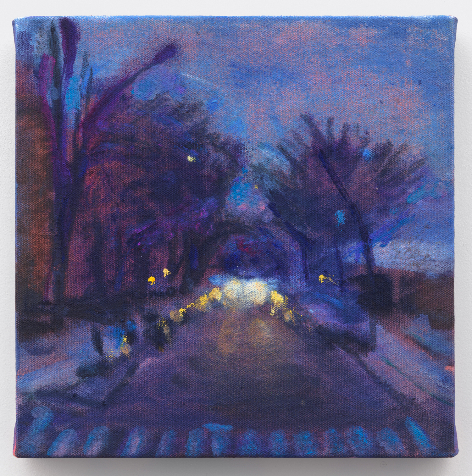 Through this ritual approach, Barber has formulated a set of constraints that are equally temporal and material, informing the physical scale of her works as much as the slowness or speed of their making. The painting’s ground becomes a portal—digging out the vibrant reds and blues that characterize her twilight works; dotting flashes of light and pulling the flurry of people and nature; sometimes etching the outlines into wet paint using the other end of her brush. Although a solo endeavor, loneliness—a theme night scenes might easily step into—doesn’t exist in Barber’s paintings. Hers is a process of sheer exposure to the world; a practice of absolute receptivity.