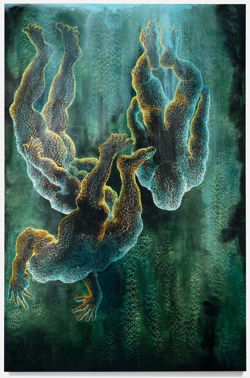 William’s new works describe underwater seascapes, suspended rock formations, tectonic splits, as well as scenes drawn from a place of memory. These images discard the kind of boundary that arbitrarily designates nation or possession. Instead they transpire at a different border: between heaven and hell, life and death, this life and the next, however we choose to name it. In this way, the ocean connotes the processes and history of immigration across the Caribbean, and at the same time visualizes a body of water as a spatial alternative, “a kind of weightless freedom.” Likewise the cave—of which there are hundreds in the artist’s birthplace of Haiti, both containing and preserving a kind of subterranean archive of the country's past—appears stripped of gravity, forming a pocket of space now in closer conversation with sky than ground. In other works, reimagined scenes from the artist’s childhood transfigure familial memory into mythology. Herein lies the body’s capacity to remember home, to remake space in the present.