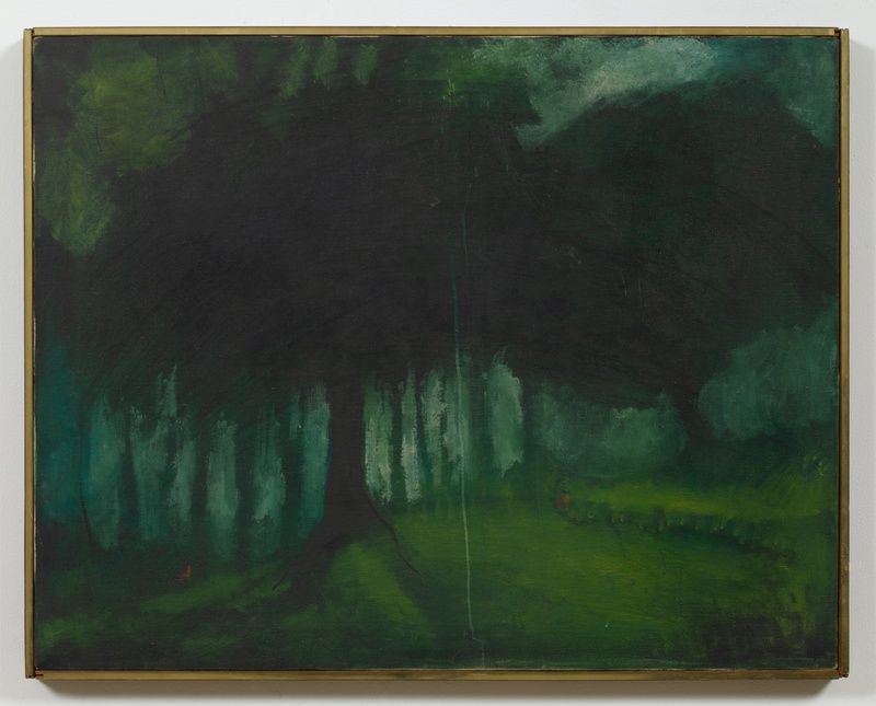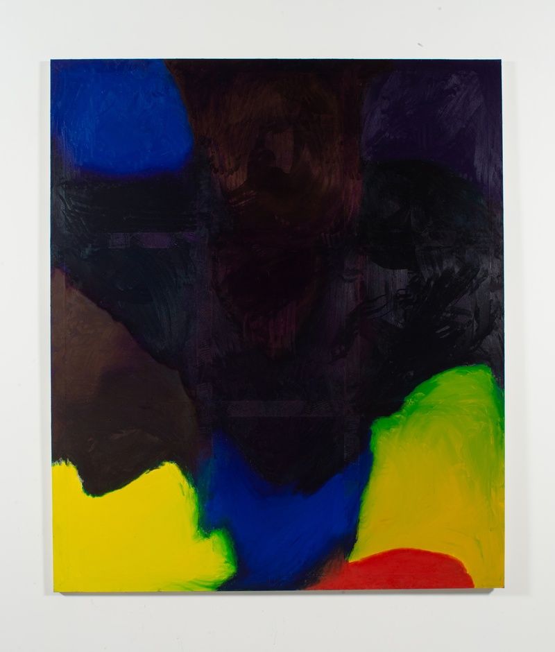John McAllister’s phosphorescent, illuminated landscape paintings observe the strangeness of nature and its cycles. rapt haven held (2025) gently contrasts the singular course of a human life with the perennial cycles of the environment, seeming to depict a ceaseless “in between” that could be read equally as dawn, dusk, daylight, or night. In this work, the sky’s clouds glow gently with a kind of heavenly light, contemplative humanity’s relationship with nature in a modern homage to early 20th-century aesthetics. The only other legible “image” in the exhibition is also a landscape, Geoffrey Holder’s Untitled (c. late 1970s). Although better known for his portraiture, Holder’s landscape paintings reflect the origins of his polymathic practice as an artist and theatre performer, through his deep connection to the natural world and his early life in Trinidad and Tobago. These compositions depict lush, tropical environments rendered with a theatrical sense of atmosphere. Much like the imagined subjects of his portraits, Holder’s landscapes reach for emotional resonance over strict realism, blending personal mythologies with an almost stage-like presentation of nature.
