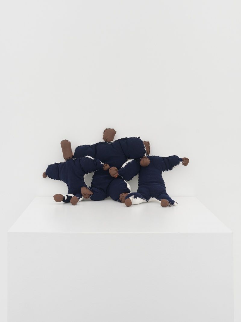 While many works in the exhibition evade the figurative image, most do lean on recognizable elements of daily life—whether rendered abstract, reconfigured for new uses, or performing apparent inversions in their material properties. In Alison Knowles’ *Found Gloves* In Line (2018), we encounter a near-perfect meeting of the three. As a key figure in the development of experimental art from the 1960s to today, and a founding member of the Fluxus group, Knowles’ use of commonplace materials, chance operations, and participatory formats blur the boundaries between art and everyday life. This sculpture in particular follows from her larger Event Threads series, initiated in 2006, composing a visual poem of found objects strung together to create a literally suspended, tactile timeline.