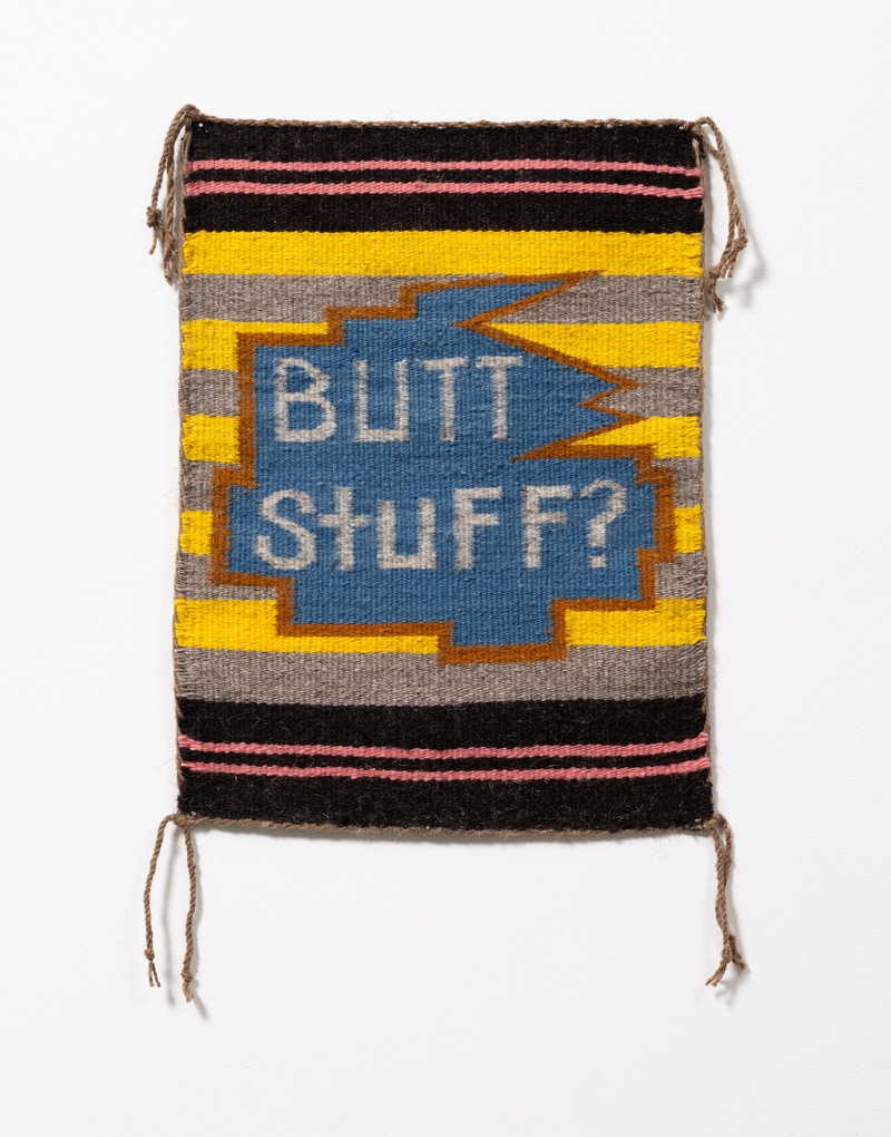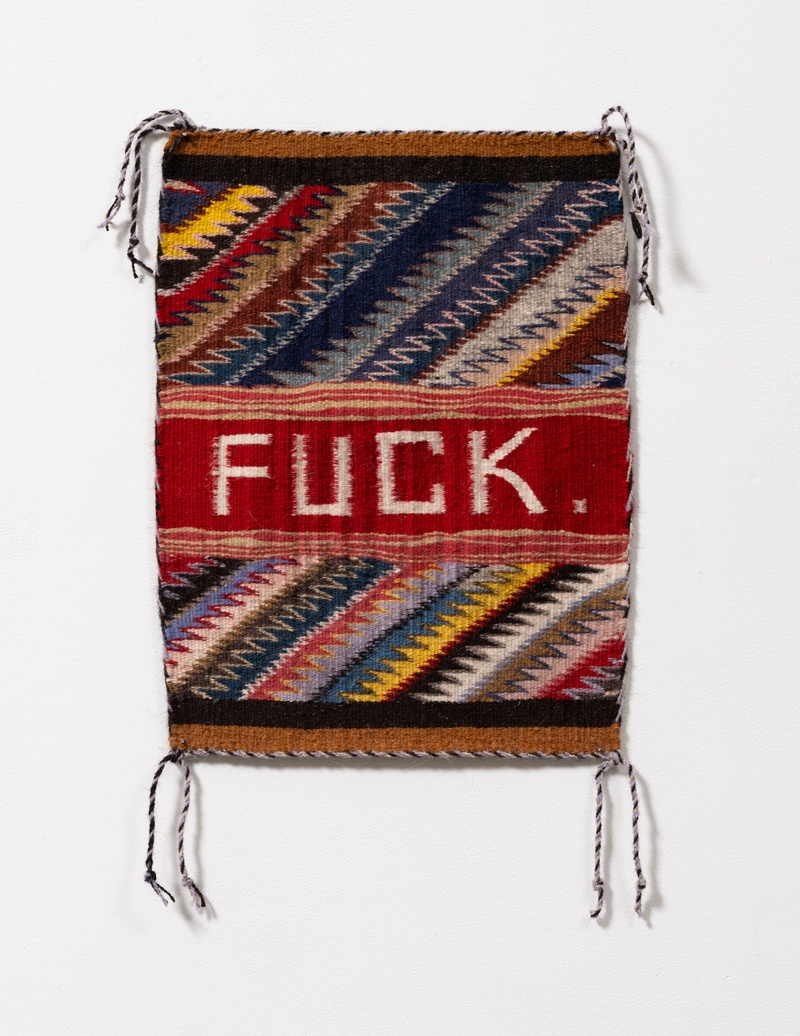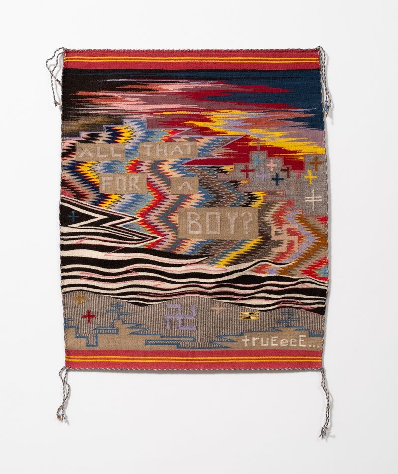 Every work showcases Tapaha’s deep-dive into technique, intertwining Navajo and European weaving methods and imagery that range from landscapes to text messages—making space for experimentation and modern subject matter in a medium that is often reverent. Inviting vulnerability, one weaving is based on a collection of the artists’ notes and love letters. Other pieces play with humor, such as one depicting a cartoon sheep Tapaha’s relatives once printed on a family reunion t-shirt. Dimensions of the design are improvisational, testing colorful serrations, combining ancient patterns, and riffing on their family’s secret techniques. Tapaha understands their work as articulating a moment caught between past and future generations of weavers in their community—simultaneously preserving and inventing tradition.