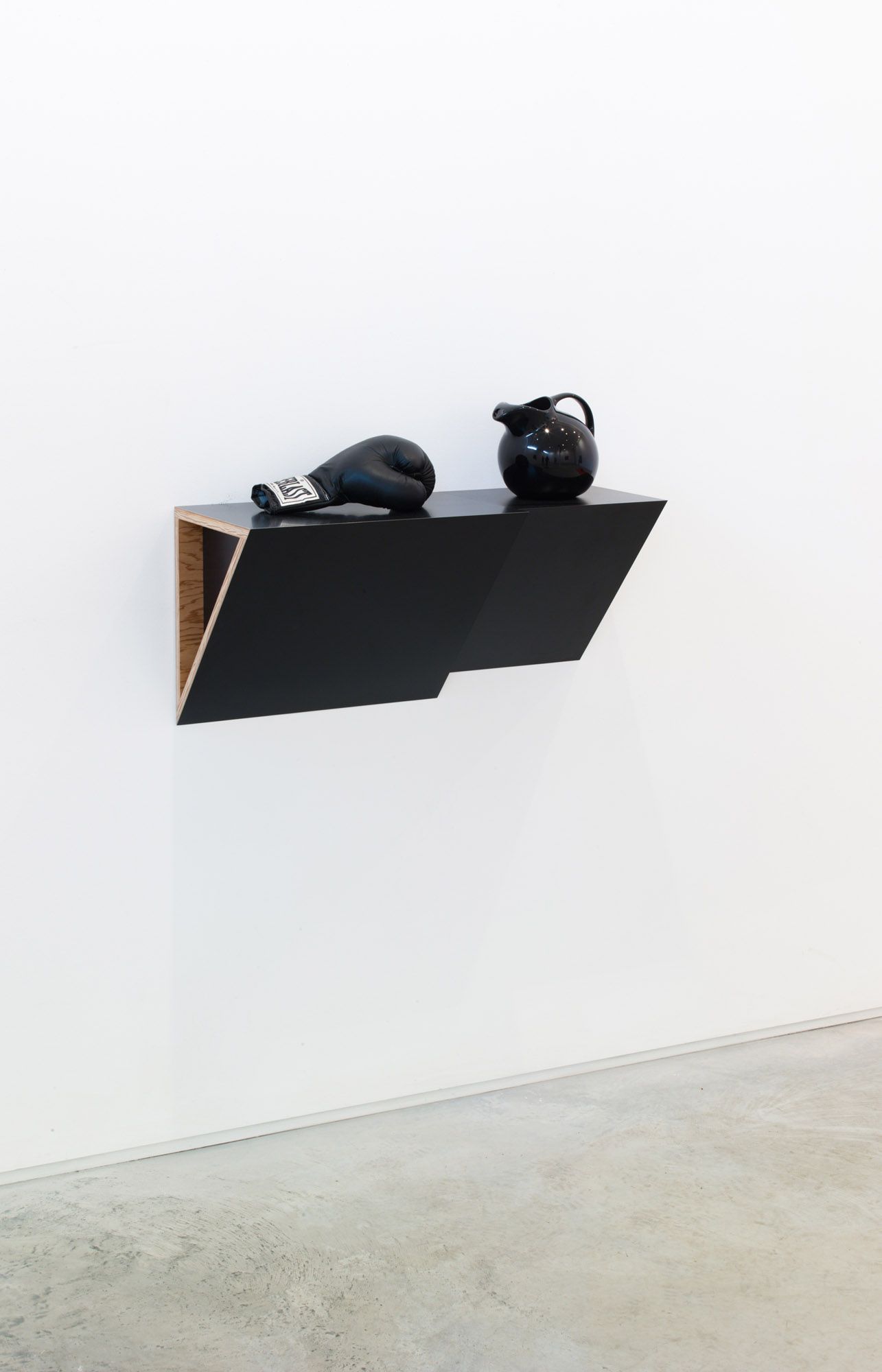 Plastic laminated wood shelf, ceramic pitcher, leather boxing glove