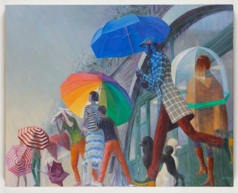 The umbrella or parasol is a trope that has appeared through paintings history, particularly in the city scenes of 19thcentury Impressionist and Post-Impressionist painters. The umbrella becomes a reoccurring character in Senior’s tableaux, appearing in various forms to be held against rain and sun. In the painting Drench, for instance, an array of umbrellas protect individuals as they scurry through a London downpour. Like many of the objects held in Senior’s paintings the umbrellas become an extension of the figure that holds them: a façade for expression and protection. A striking formal motif, the umbrellas dominate the rhythm of the painting, casting colorful filtered light over their holders. A large umbrella held by two squabbling children depicts the color wheel -- an explicit reference to the color theory that haunted Senior’s 19th and 20th century heroes -- anticipating a rainbow, which is often the sequel to heavy rain.