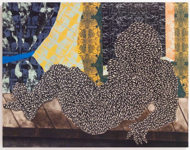 These non-gendered, non-racialized bodies strikingly document an almost intuitive sense of resilience and profundity, visualizing universal elements of the human condition that are without regard for race, sexuality orientation, or gender identity. We may be mesmerized by the beauty of their sensuous shape, but we are also transfixed by their shadows as they appear on the vividly-colored and patterned curtains, share the stage, and dwell on the ornate, painterly abstract backgrounds. Sinewy lines, seemingly frenetic curvilinear marks, guide our eyes to the ways in which William balances suggestive abstract sensibilities with expressive organic qualities. It is in this context that William’s recent work captivates us, through the haptic that suggests movement, color, form, and, most importantly, a harmonious sensuality. His mixed-media works possess a compositional logic that examines how painting and printmaking energetically coalesce on the surfaces of the panels. In these decidedly detailed-oriented works, William explores the role of painting and printmaking as processes that intertwine the hand with the mechanical. We can almost feel the reverence for the materiality generated by vivid areas of color and a meticulousness of line. This cross-disciplinary expertise allows the viewer to relish in his deft control and skill in emotive mark making. The works gathered in this exhibition provide further demonstration of the wonder and ingenuity of William’s unique visual harmony and compositional dynamism.