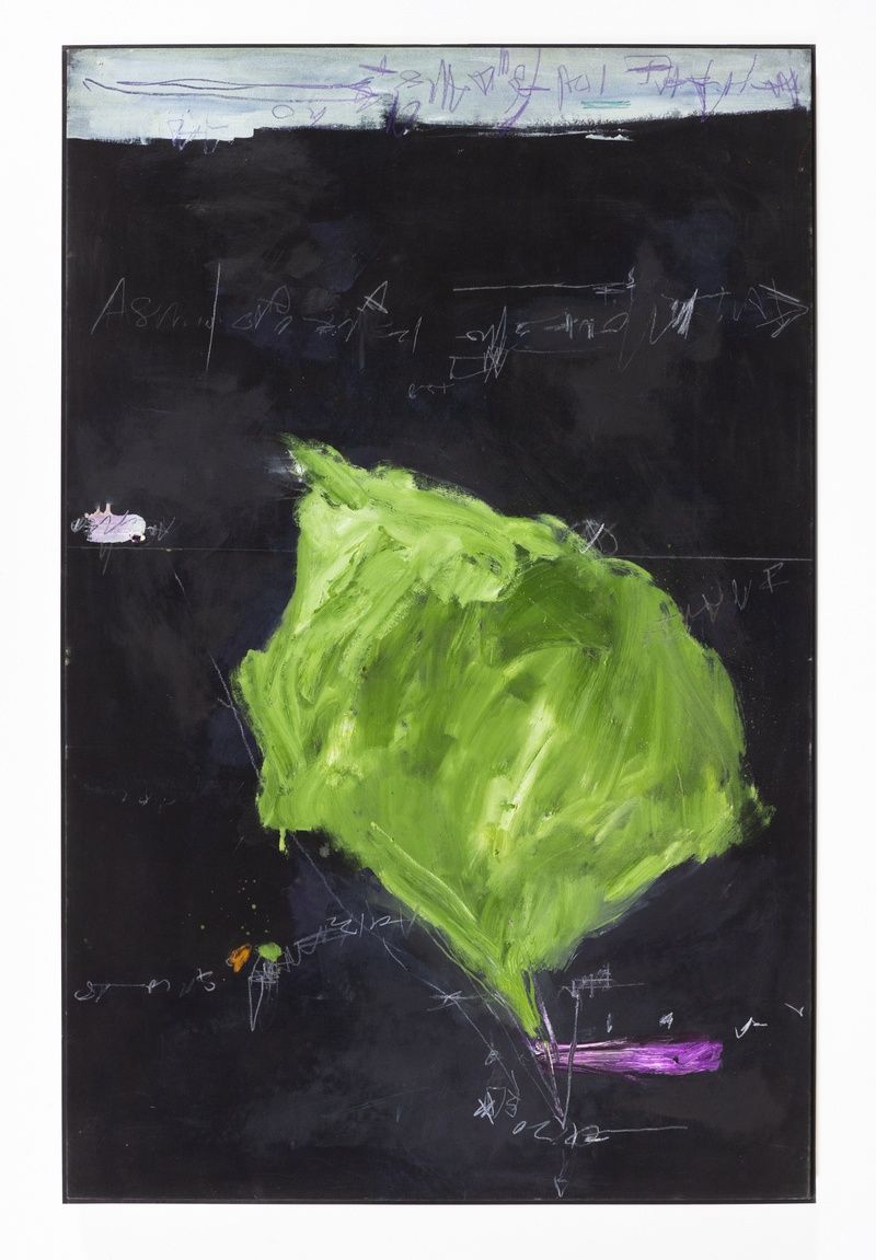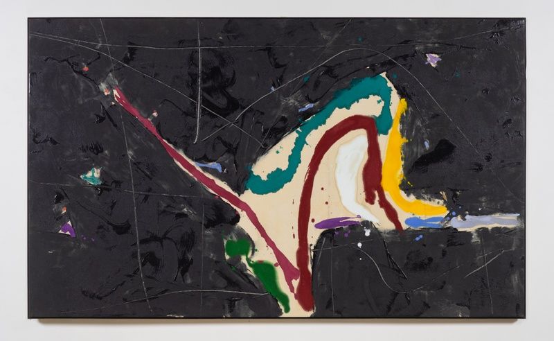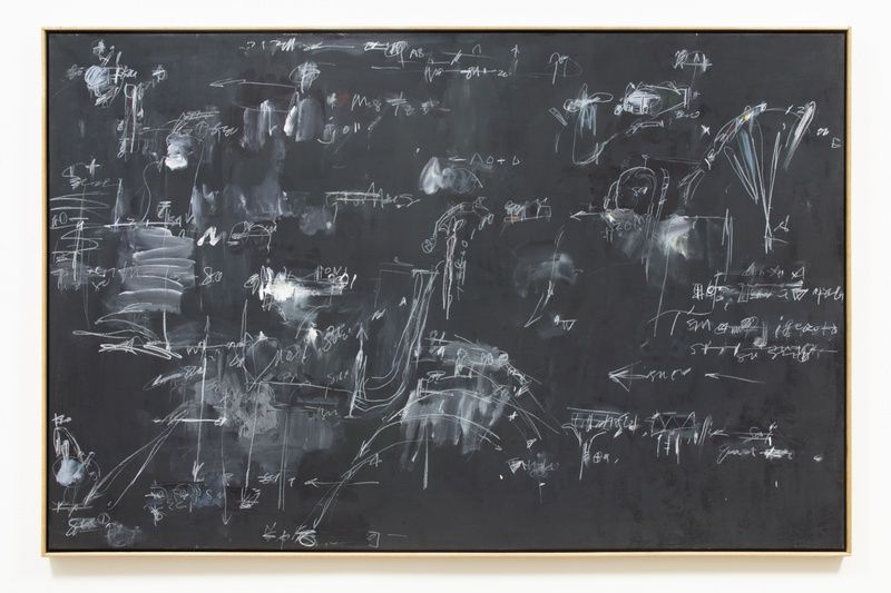 In order to approach the sheer depth of Saito’s persistent investigations, the works on view carry the commonality of the color black. In his earlier works, carrying the influence of Color Field painting, black washes across the surface while brilliant color peaks through and makes space against unfinished canvas. Next, colors would sit alongside or on top of one another, surrounded by a series of undecipherable marks. In another, color vacates so that light and dark are more explicitly directed by a dense overlay of drawn elements, resembling a chalkboard. With these marks Saito referenced choreographic notation, to be potentially read as a map for responsive movement. Later, color and tone occur rapidly all over, possibly implying the shimmering reflection across water or dappled light, becoming lyrical. In some works, windows of light open at the edges and corners of the canvas. In others, elements of the alphabet enter the frame, adapting language and letters into compositional forms. Over time, questions of form, color, balance, and movement were at once queries of light and darkness, too.