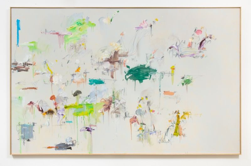 Saito attended to a number of concerns throughout his decades of painting, which he would continually reference and revisit, forming feedback loops across time. At the core of his work is the early interplay between theater and painting—informing the body’s movement of paint across the surface; switching status between backdrop and immediate surface; implying observation and delivering sensation. Early on, he moved from using acrylic to oil paint (although returned to it much later). The quick run of acrylic required that the canvas be fixed to the floor and therefore rapidly danced across, whereas the slowness of oil afford a vertical orientation and more direct interaction between the hand, wrist, and surface. Relatedly, the translucent, changeable quality of oil allowed a deeper integration between the paint and its ground, rather than necessarily consigning the canvas as background. Through his intensive commitment to painting, Saito was able to render expression more explicit, permanent, and exclusive.