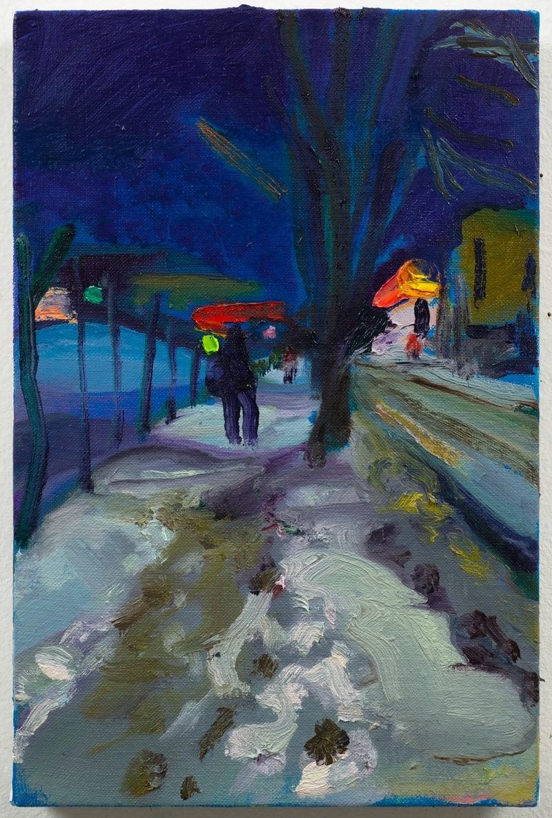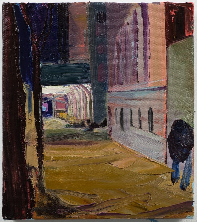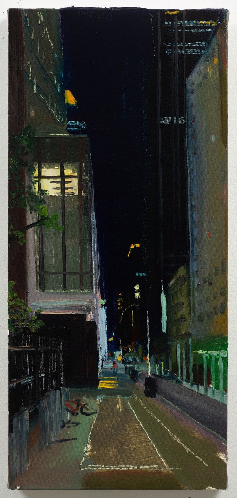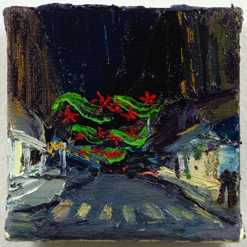 Maspeth Moon presents a new series of Izzy Barber’s observational plein air paintings of daily life across New York. Neither symbolic in their imagery nor purely abstract, Barber’s paintings readily capture the sensations and movements of life as it happens in shared spaces. As one deciphers their details, these works become time-based in a new sense, steadily revealing elements of their subjects within vivid, textured scenes. Here, detail plays against ground, as if caught in a satisfactory moment that might as easily dissipate again. Certain areas of focus emerge in each: across multicolored bodies of fruit, momentary human gestures, fizzing lights, and the linear accents of signs and buildings. A sense of perspective is firm in each instance and yet ever shifting for the artist: peering down long streets, up brief inclines and into the lit ceilings of higher floors, or looking steeply downwards from those upper stories. Barber’s remarkable manipulation of mood through image demonstrates her studied eye and an intent engagement with her surroundings through this series, which she began over the past year. Brought together, these works carry the brilliant dynamism that exists in each moment of life as it continues across the city. As Barber returned to certain locations, they convey its distinctly cyclical yet changeable nature as well.