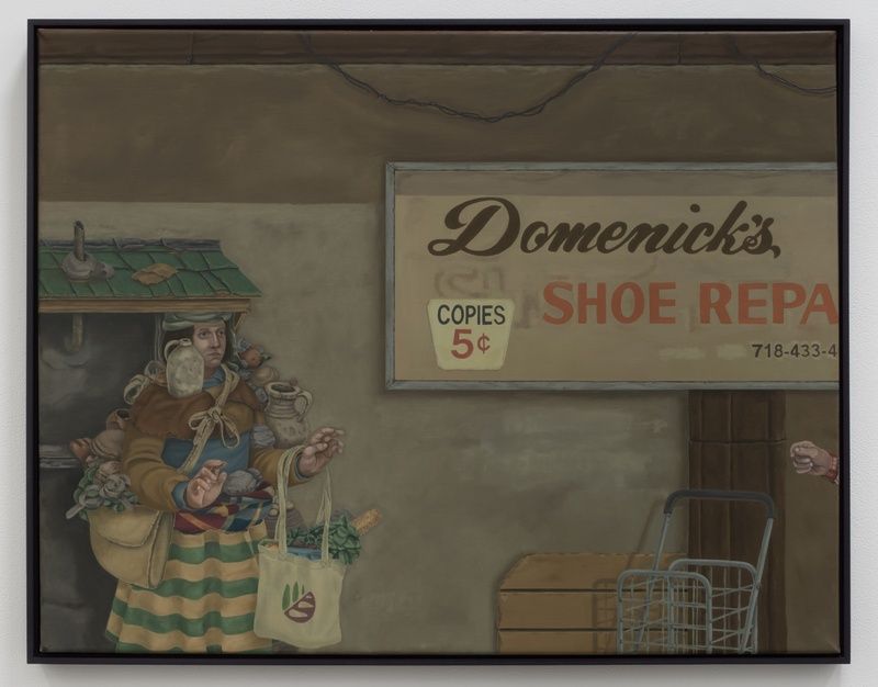 Michael Cline is a self-described storyteller, making paintings filled with strange configurations of people and their surroundings. Bodies are in motion and yet caught catatonically stiff within streetscapes, contained by windows, or piled with objects. These scenes tend to be awash with a greenish light, adding a grotesque quality to their discordant details and faded palette. Liberally mixing styles and narratives, Cline renders an odd feeling of ambiguity and vulnerability.