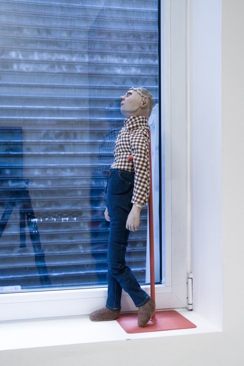 Sharp shifts in scale add to this illusionistic effect. In many works a figure might stand in the shallow space between the flat surface of a wall and the picture frame. Details like soft shadows, a crack in the wall, or an odd doorway furnish this backdrop. By contrast, Cline’s earlier highly textured relief works move drastically closer to this plane, focusing on left-behind pieces of tape, torn bits of paper, and false wooden beams in trompe-l’oeil fashion. Impromptu and handprinted signs feature repeatedly, tipping into awkwardness with a misspelled word or adjusted numbers. These pieces of information provide an in-between setting that is as telling, if not more-so, as the characters they contain. Spilling with symbols, Cline’s works are irreducible to a single meaning, interval, or depth.