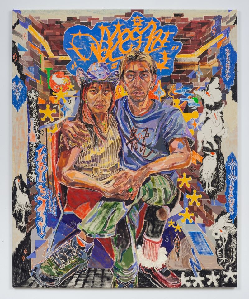 A distinct sense of symmetry can be found in yi Hou’s densely-detailed images, contributing to a compositional logic that is able to hold together a great deal of texture around each of the relationships being represented. Negotiating questions of opacity and (il)legibility, yi Hou employs polysemic symbols such as the five-pointed star, an icon laden with signification between East and West, to emphasize the buried yet multifarious meanings that surround his subjects. In this vein, at times the artist fuses the Chinese calligraphic tradition with graffiti seen on the streets of New York. Yi Hou also makes poetic use of the borders of his works, treating this marginal space as an expression of the interrelation between himself and the sitter—while at the same time reflecting upon the limits of grasping this relation. In doing so, the artist’s paintings of others become a form of address, conjuring new signs and meanings to be shared in space. Here, yi Hou intricately demonstrates, in his words, “painting as a practice of dignity.”