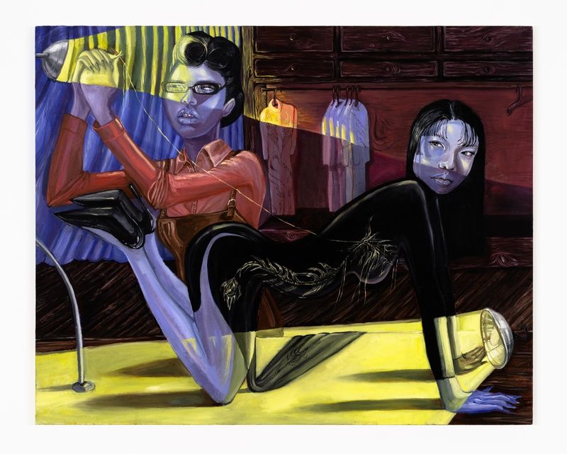 Kane Huynh (b. 1998, New Orleans, Louisiana; lives and works in New York) is a painter and fashion stylist whose works interweave her ancestral history and life in the present, often including self portraiture, Vietnamese folklore, and depictions of her experience as a trans woman. Huynh’s work, The Tailor’s Office, references her longing for home and memories of her grandmother’s black Áo dài—the Vietnamese national garment. The painting depicts a scene between two women: a tailor at work and a woman arched like a cat on her desk. Huynh imagines this narrative scene as taking place in 1960s Vietnam during the American-Vietnam war, in secret and at night. She studied a BFA at The Cooper Union in New York and her work is currently on view in her hometown in Pop Gun.