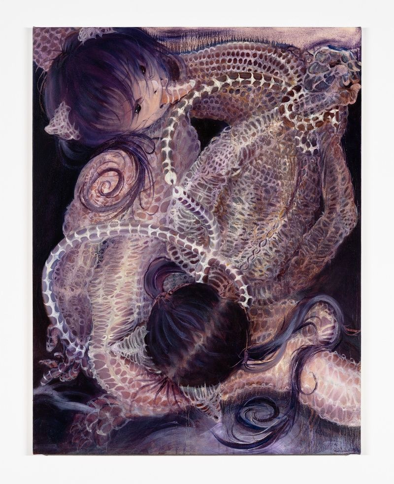 Min Jia (b. 2001, Ürümqi, China; lives between Berlin and Toronto) is an artist and writer whose work explores themes of migration and adaptation through a surreal lens. Like their short stories, the artist’s paintings offer a glimpse into metamorphic narratives. Chastity Game tangles together hair, scales, and spinal columns into a tightly wound knot bursting at the canvas’ edge. Min Jia is currently on hiatus in China studying the art of traditional Chinese shadow puppet theater under a trained master. They received a BFA in Interdisciplinary Sculpture from the Maryland Institute College of Art in 2021 and have been featured in exhibitions at X Museum, Beijing; A.I. Gallery with Linseed Projects, London; Universität der Künste Berlin; MKG127, Toronto; Hunt Gallery, Toronto; Beaver Hall Gallery, Toronto; Student Space Gallery, MICA; and Daesan Gallery, Ewha Womans University, Seoul.