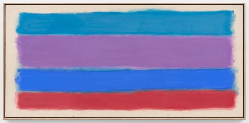 Lipsky’s paintings are rarely static, yet they leave a strong impression in the mind’s eye, like an after-image. Although surfaces vibrate with energy, they also evidence a clear undercurrent of deliberation and control. Color is not merely pigment but a force that gathers momentum across the canvas, rhyming in similar but varied arcs. One can imagine the horizontal movement of her arms, perhaps in unison, with which each band of color was applied using a saturated silk sponge; but in truth that moment remains hermetic, a code unknown. What’s foregrounded is the act of negotiation between the artist’s discernment and the materiality of paint itself, as if Lipsky were in conversation with each color, coaxing it to reveal more of itself through subtle and confident tonal shifts and in relation to its neighbors. Delineations between gesture and form are blurred, and instead each painting forms into a single pulse.