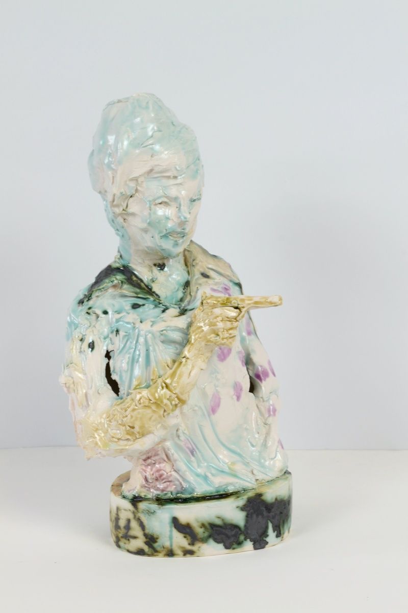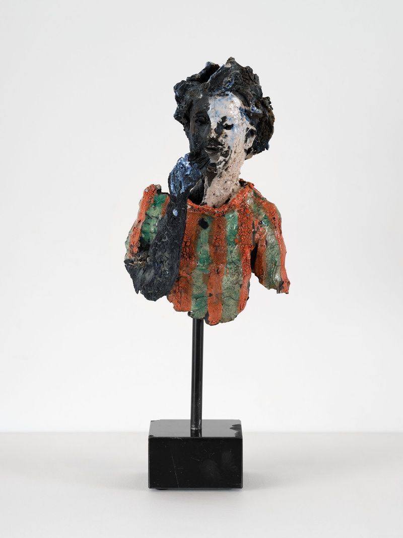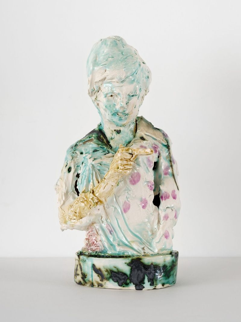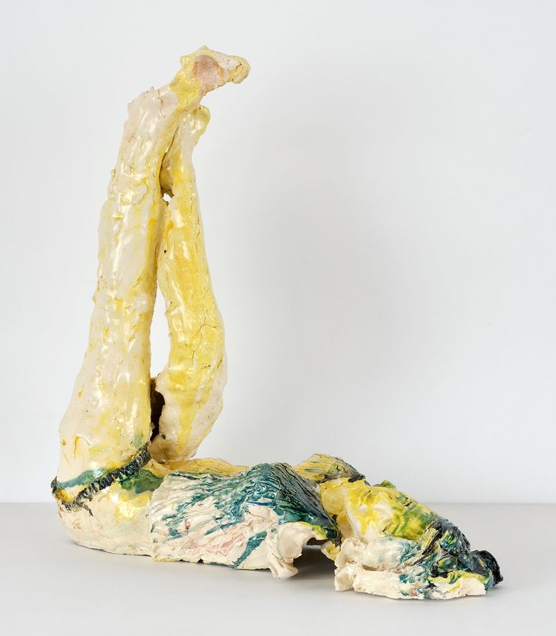 Lahti’s ceramics—ranging from full body to torso or limb, sometimes fragmented—each contain an energy distinctly their own. Brought together, their independent attitudes and gestures also hint at the hidden shared universe from which they emerge. While strongly informed by her attention to the unfolding present, Lahti’s works are just as deeply influenced by human artifacts from all ages. A congregation of found images forms the backdrop to her cast of figures. Magazine spreads, catalogs of art history, museum visits, and a range of pop-cultural materials convene in the studio alongside the artist’s internal assemblage of observations. Wordlessly, the works we encounter speak to the most powerful truth to be found in even the smallest of relics.