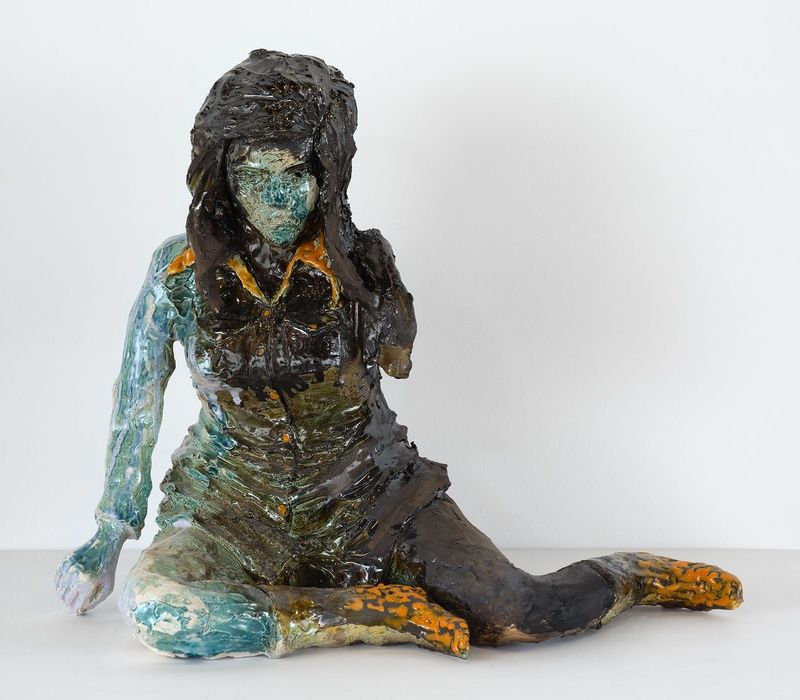 As Lahti’s internal observations wind their path toward three-dimensional structure, the artist experiments in forming, shaping, and glazing her materials. Then, literally solidifying into its own separate existence, each ceramic figure is ultimately and unpredictably defined through the final firing process. Accumulating joys and fears, in that bright, concealed moment inside the kiln, the work dramatically settles into its furthest expressive threshold. At times vivid, muted, or uneven colors accompany bubbles, seams, and other structural irregularities as integral components rather than technical aberrations.