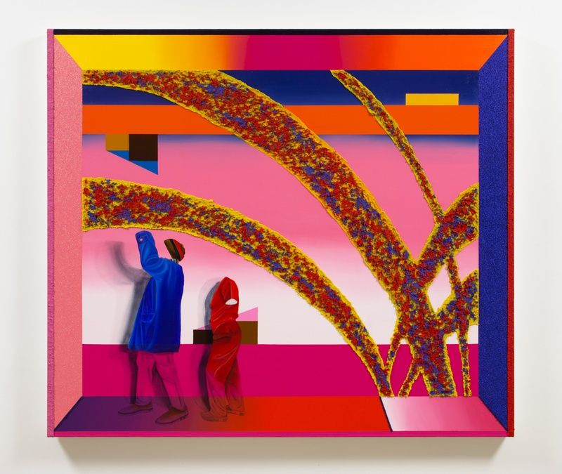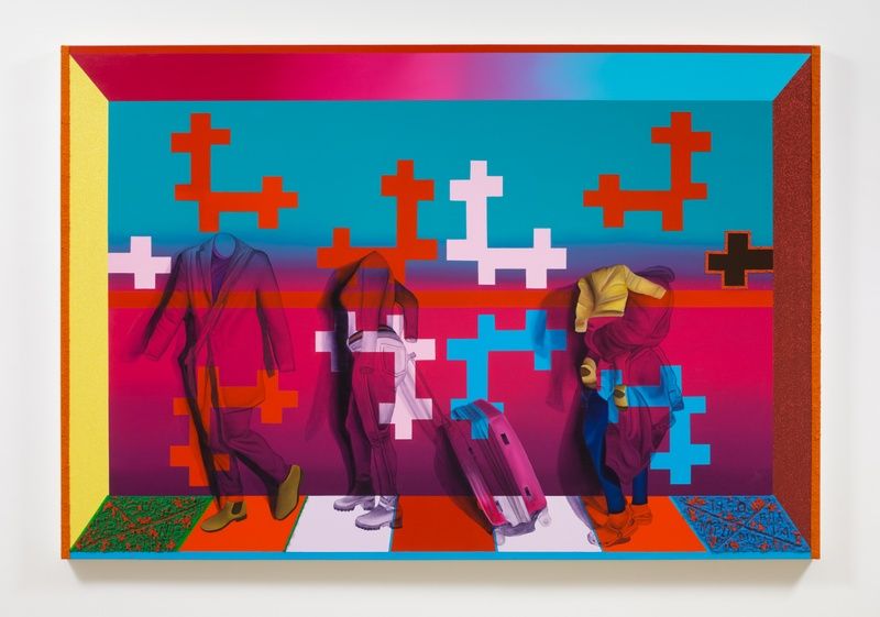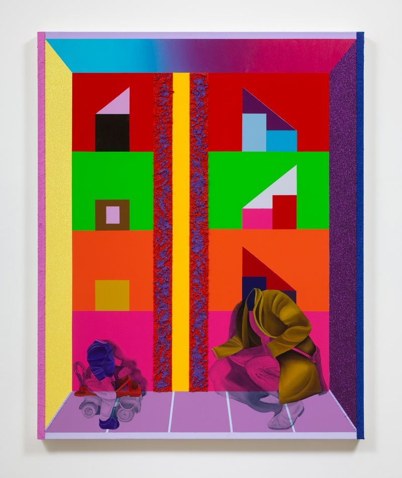 Jamaal Peterman’s complex, cryptographic work reproduces the world as a kind of simulation that is accessed through the portal of each painting. Following from the artist’s exhibition last year—which spoke to invisible micro and macro systems of corporate finance, surveillance capitalism, and their interlocking weapons of destruction—Peterman’s new body of work moves in closer to the body as it travels through place and time, and as the artist reflects on his own movement through life.