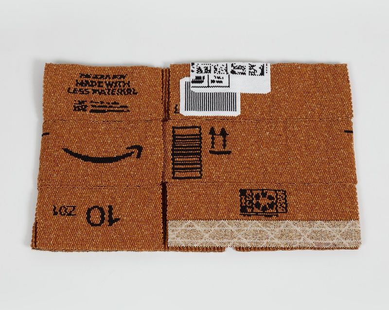 NICO WILLIAMS’ work begins with the found object. The artist is drawn to debris that he collects from his surrounding Hochelaga neighborhood in Tiohtià:ke/Montréal—materials coded with economic, political, and societal conditions. In the studio, he creates a digital rendering of the found object that is then used as a pattern for its recreation stringing together glass beads with thermally bonded weaving thread resulting in an intricate and sparkling soft sculpture. In this presentation, Williams creates a dialogue between four beaded sculptures: a flier for a supermarket, a strip of danger tape, an Amazon delivery box, and a wallet containing his Indigenous status card.