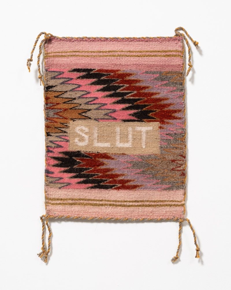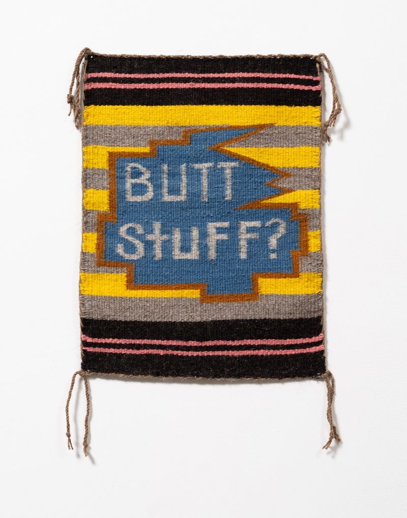 Every work showcases Tapaha’s deep-dive into technique, intertwining Navajo and European weaving methods and imagery that range from landscapes to text messages—making space for experimentation and modern subject matter in a medium that is often reverent. Inviting vulnerability, one weaving is based on a collection of the artists’ notes and love letters. Other pieces play with humor, such as one depicting a cartoon sheep Tapaha’s relatives once printed on a family reunion t-shirt. Dimensions of the design are improvisational, testing colorful serrations, combining ancient patterns, and riffing on their family’s secret techniques. Tapaha understands their work as articulating a moment caught between past and future generations of weavers in their community—simultaneously preserving and inventing tradition.