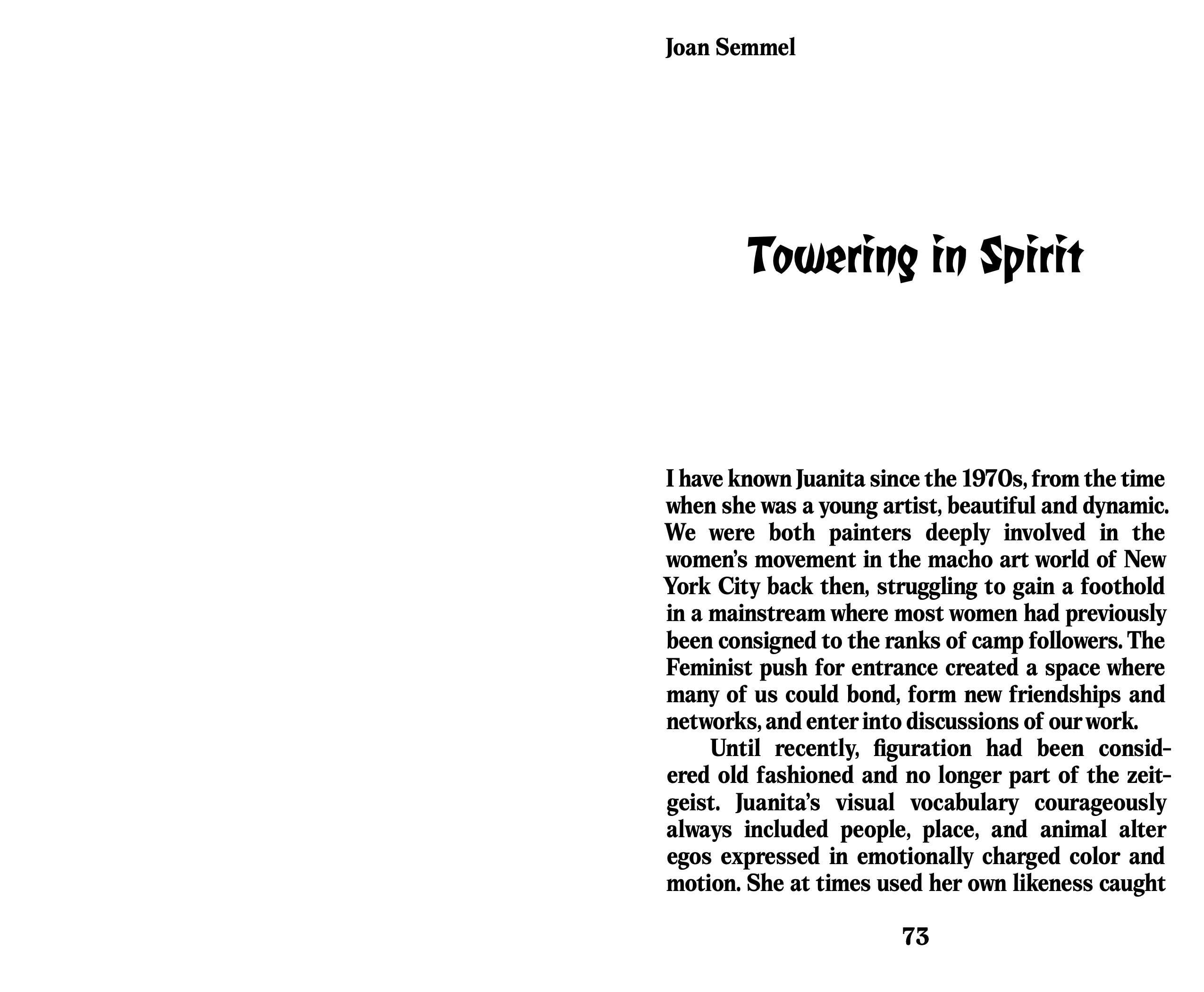 "Juanita opened up a world to the viewer of an imagination that had traveled through the extremes of feeling and managed to extract from it a dynamic and moving panorama of life and art, ever resistant and amazingly resilient, beautiful, rich, and alive."—Joan Semmel